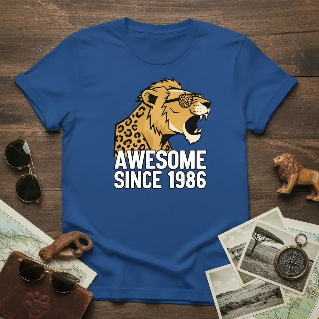 This striking t-shirt showcases a powerful cheetah mid-roar, complete with cool, leopard-print sunglasses that add a touch of vintage charm. The impactful “AWESOME SINCE 1986” text is rendered in clean, white lettering, making it pop against the vibrant fabric. It’s an ideal way for anyone born in 1986 to commemorate their special year with pride and a dash of wild style. This design is crafted to be a conversation starter, embodying a spirit of confidence and fun.