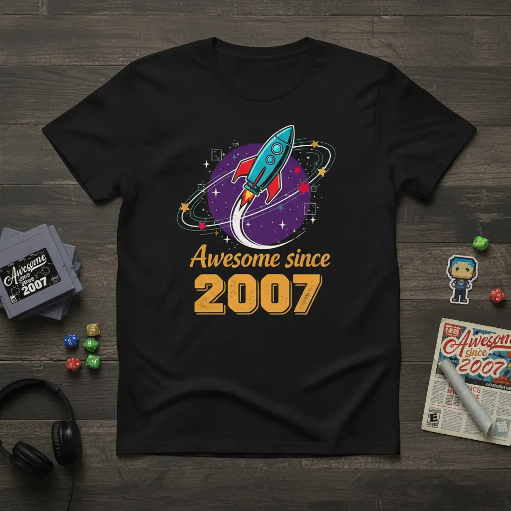 This vintage-inspired t-shirt is designed to celebrate the legendary year 2007. Featuring a dynamic retro rocket blasting off into a cosmic swirl, the “Awesome Since 2007” text is emblazoned with a distressed, eye-catching font. It’s the ideal garment for anyone who wants to proudly declare their birth year with a touch of nostalgic flair.