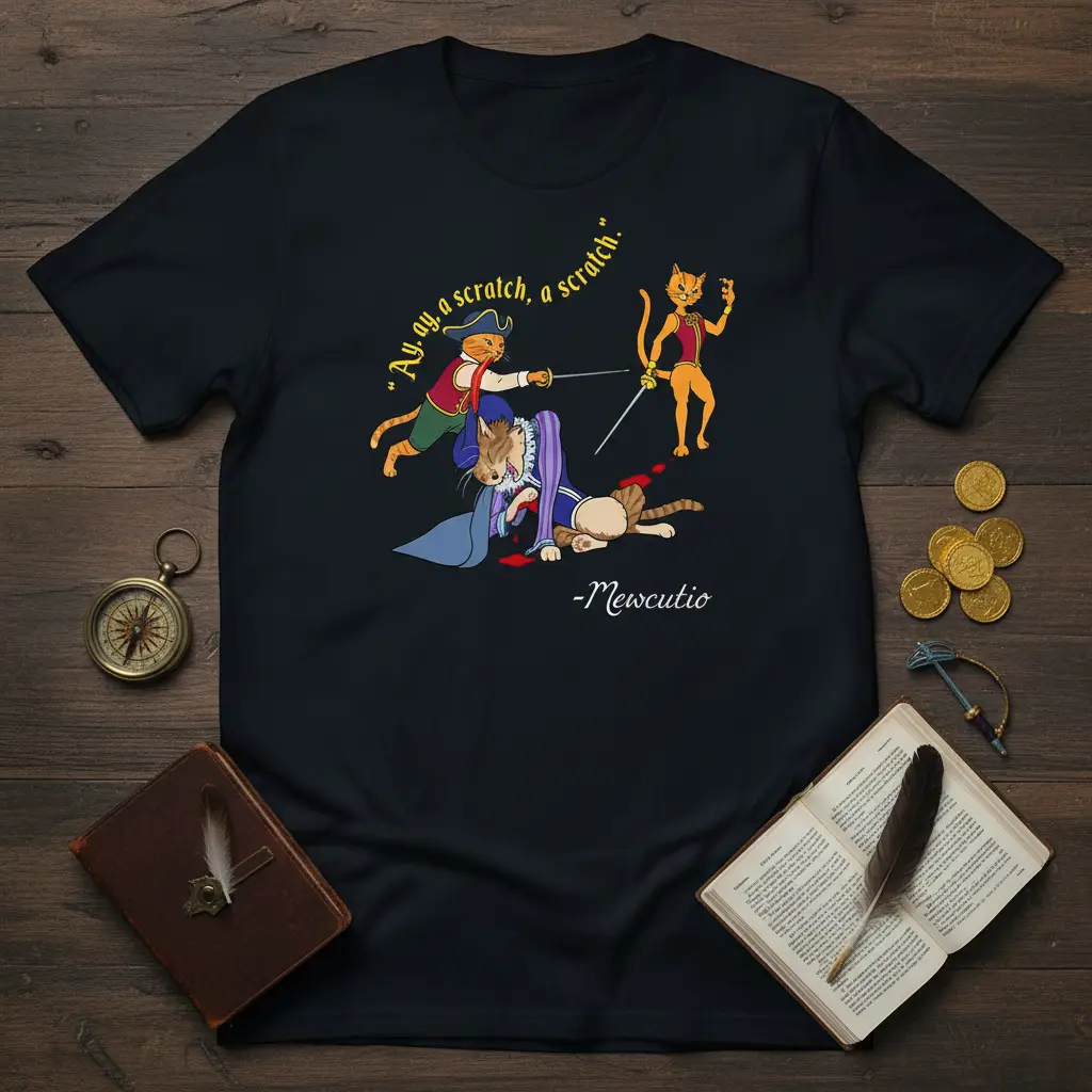 “Ay, ay, a scratch, a scratch.” This captivating t-shirt design brings a touch of swashbuckling humor and feline charm to your wardrobe. Featuring a dynamic scene of cats engaged in a rapier duel, it’s the perfect way to express your love for our whiskered companions and a good dose of witty wordplay. The unique artwork and clever quote make this tee an instant favorite for anyone who appreciates a bit of playful drama and artistic flair in their clothing choices.