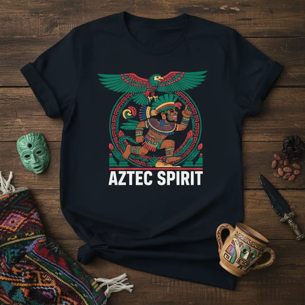 This t-shirt prominently features the phrase “Aztec Spirit” beneath a captivating illustration. The artwork depicts a powerful warrior figure adorned in traditional regalia, complete with an elaborate headdress and intricate body adornments. Hovering above is a majestic eagle, a creature of immense significance in Aztec mythology, symbolizing power, vision, and the divine. The entire composition is encircled by detailed patterns and motifs that are characteristic of ancient Aztec art, creating a visually striking and culturally rich design.