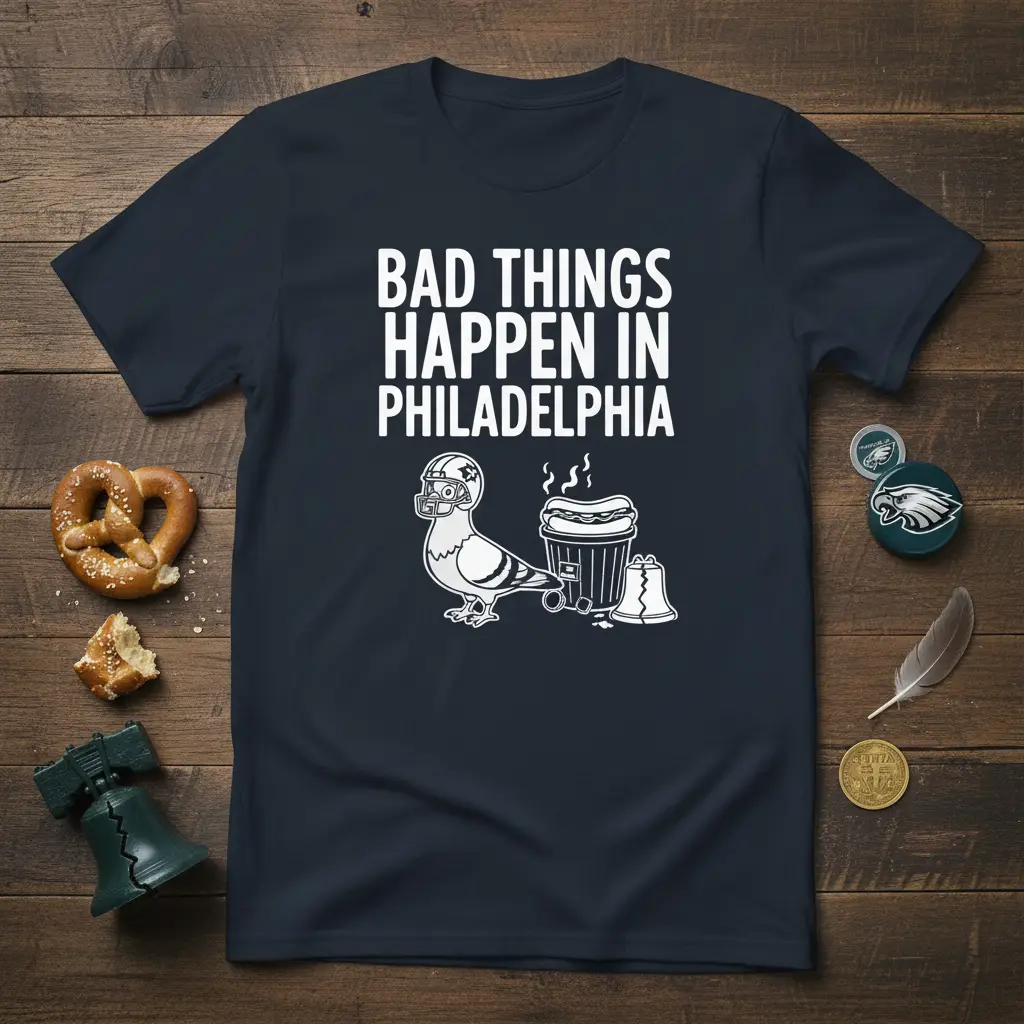 Bad Things Happen In Philadelphia—this iconic phrase is emblazoned on this t-shirt, capturing a sentiment familiar to many who love this vibrant city. It’s more than just a slogan; it’s a nod to the unique spirit and resilience that defines Philadelphia, often celebrated with a touch of humor. This design is crafted for those who appreciate the city’s character and aren’t afraid to embrace its quirks. It’s a perfect way to show your connection to Philly, whether you’re a lifelong resident or a devoted fan from afar.