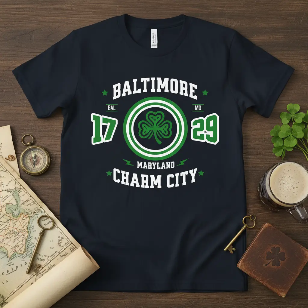 This unique t-shirt celebrates the heart of Baltimore, Maryland, known affectionately as Charm City. The design features the prominent text “Baltimore Maryland Charm City” along with a festive shamrock graphic, making it ideal for St. Patrick’s Day or any day you want to show your local spirit. The numbers 17 and 29 are integrated into the design, adding a special touch that resonates with the city’s heritage.