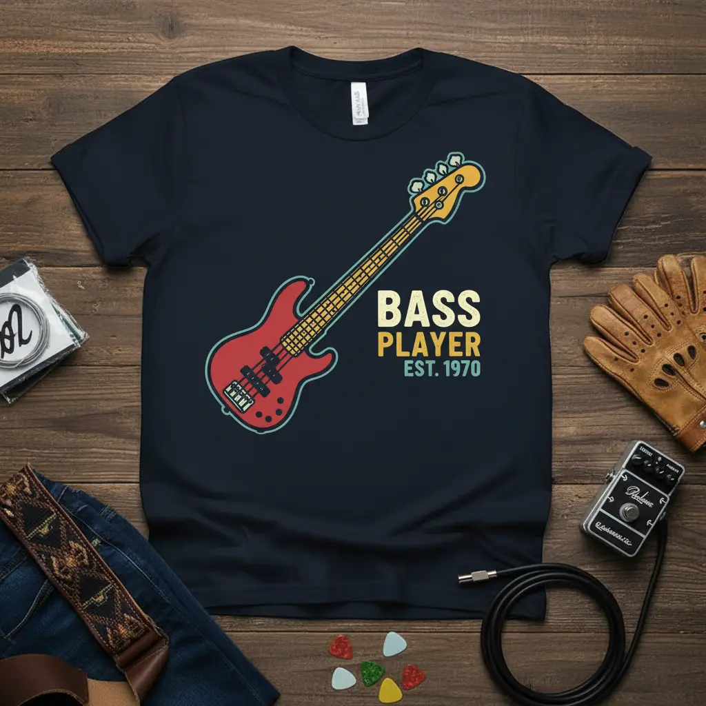 The combination of the vintage aesthetic and the clear declaration of being a “BASS PLAYER EST. 1970” makes this shirt stand out. It’s not just clothing; it’s a statement about your musical roots and your commitment to the low end. This design is sure to be a favorite among bassists and music lovers alike, sparking conversations and connecting fellow enthusiasts.