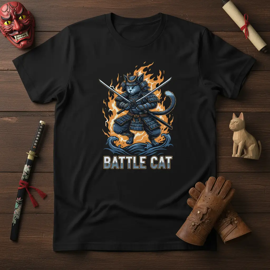 This T-Shirt proudly displays the “BATTLE CAT” design, a powerful visual that blends the majesty of a samurai warrior with the charm of a cat. The intricate armor and determined gaze of the feline warrior create an unforgettable image. The dynamic interplay of fire and water elements surrounding the cat adds a sense of epic scale and intense action to the artwork.