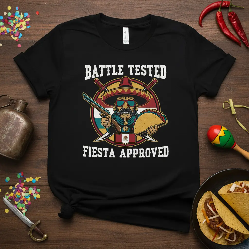 This striking design features a charismatic Mexican character, complete with a traditional sombrero, a confident stance holding a pistol, and a delicious taco. The text “Battle Tested Fiesta Approved” is emblazoned above and below the graphic, creating a powerful and memorable visual. It speaks to a spirit of adventure and a love for festivities that are both epic and enjoyable.