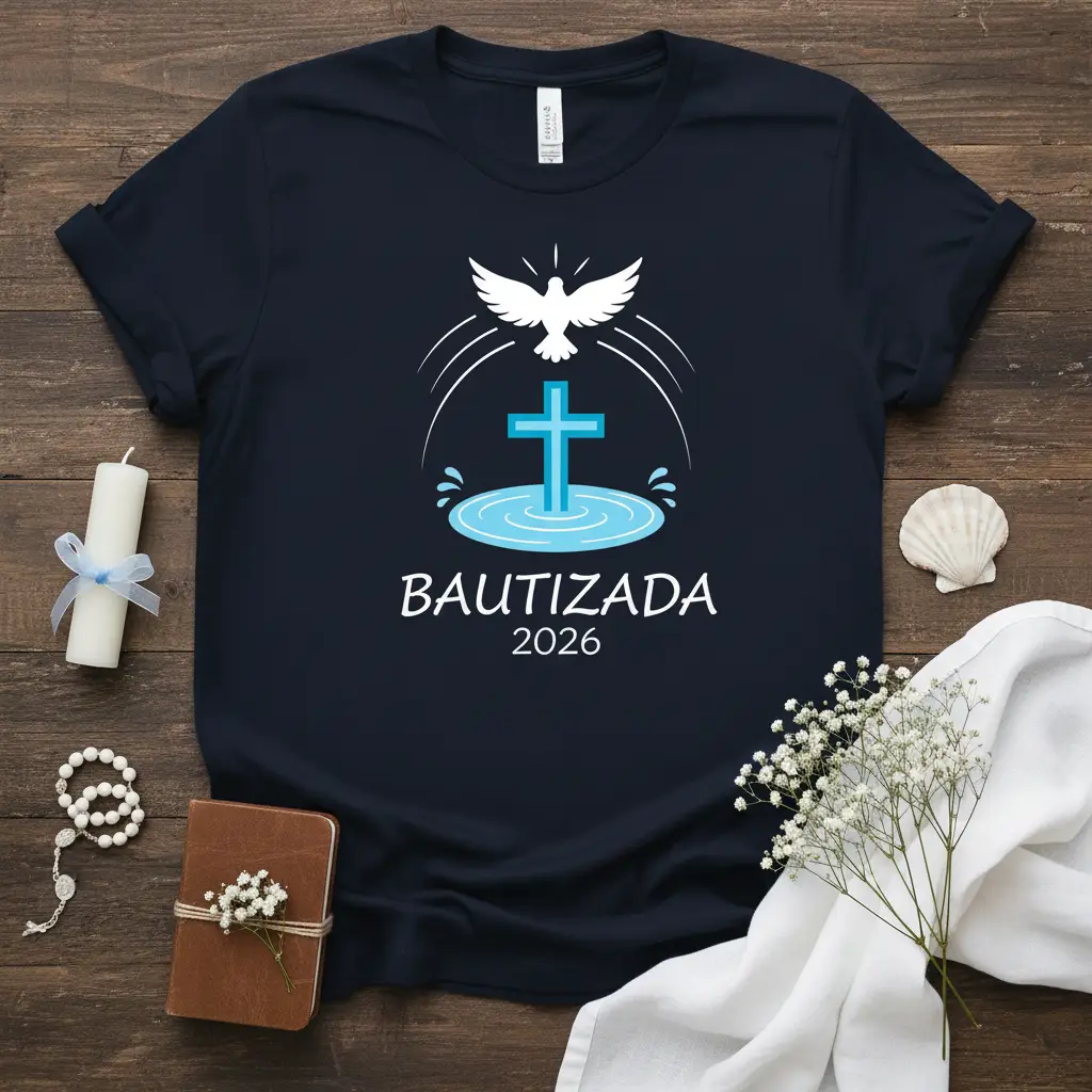 Bautizada 2026 marks a significant milestone, a sacred occasion filled with faith, family, and blessings. This special t-shirt is designed to commemorate such a cherished event, making it a perfect keepsake for the honoree and their loved ones. The design features a serene dove, symbolizing peace and the Holy Spirit, descending towards a vibrant blue cross, representing faith and new life. Surrounding the cross are gentle water ripples, evoking the sacrament of baptism. This thoughtful apparel is ideal for wearing during the celebration or as a lasting memento.