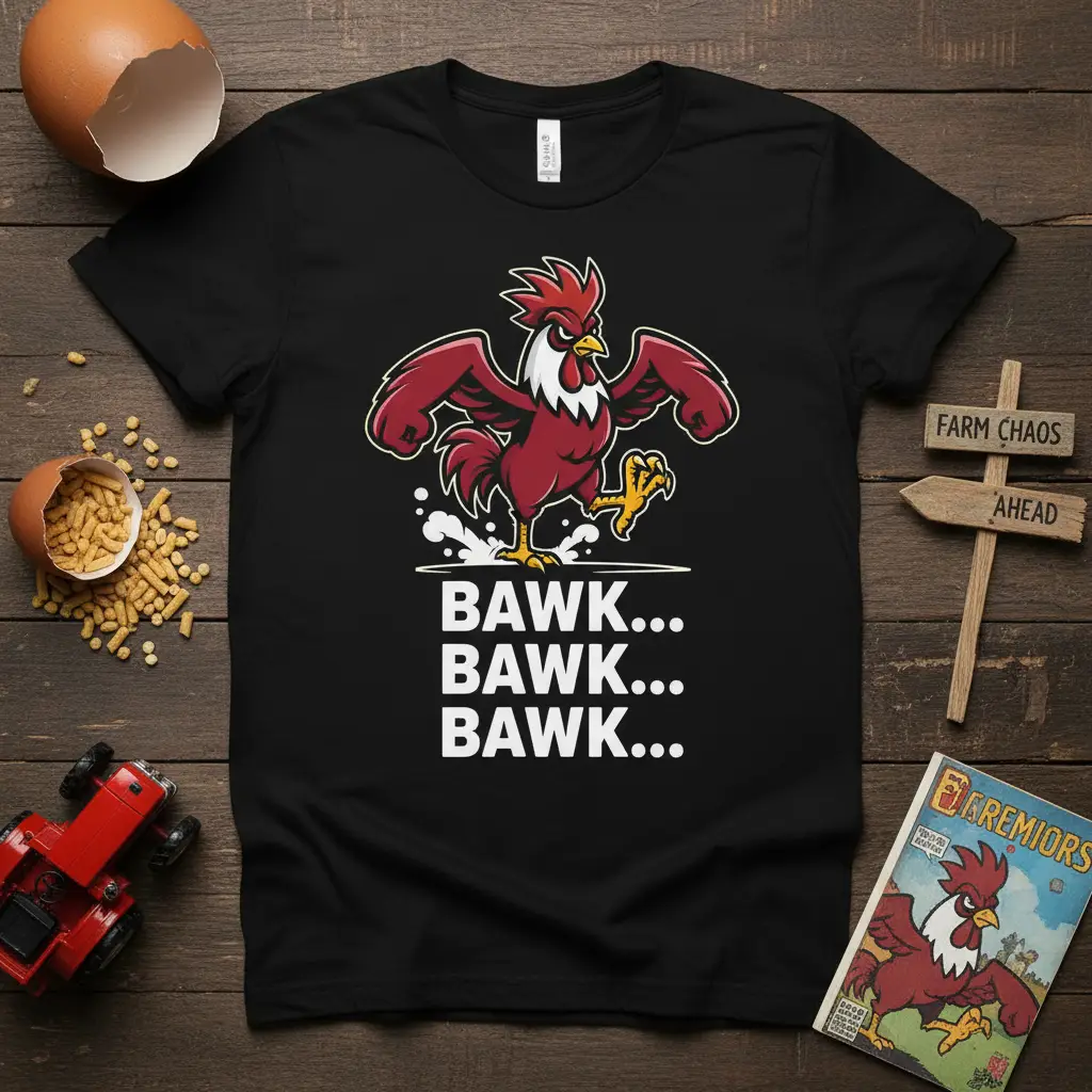 This t-shirt captures the essence of farmyard antics with its bold “BAWK… BAWK… BAWK…” text and a spirited cartoon rooster graphic. The design is perfect for anyone who loves chickens, farming, or just enjoys a good dose of quirky humor. It’s a conversation starter that embodies the fun and lighthearted spirit of country life.