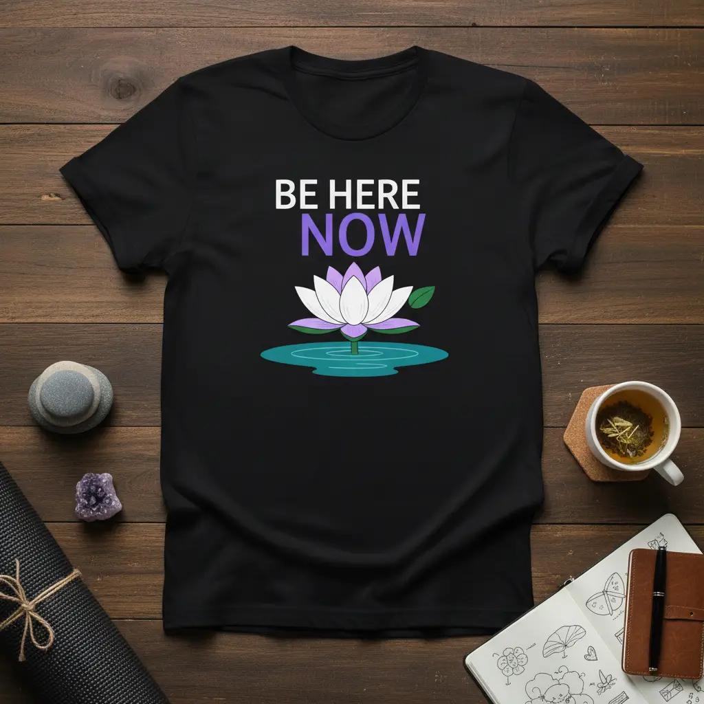 BE HERE NOW Lotus Flower T-Shirt for Mindfulness and Meditation