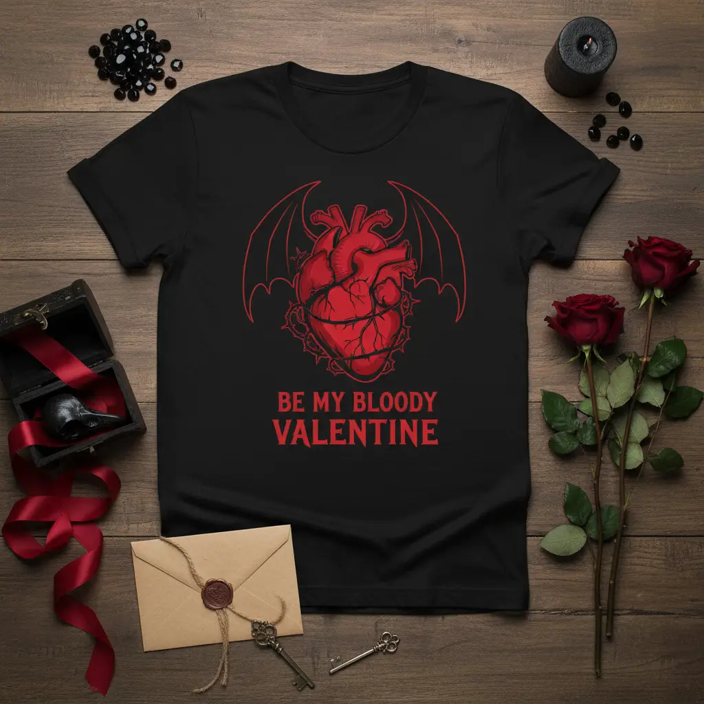 This unique t-shirt design features a detailed anatomical heart rendered in a vibrant red, symbolizing passion with a dark twist. Accompanying the heart are menacing bat wings and thorny vines, adding a layer of gothic mystique. The phrase “BE MY BLOODY VALENTINE” is emblazoned across the design in a bold, distressed font, perfectly complementing the overall dark aesthetic. It’s a statement piece for anyone looking to celebrate love in a style that’s anything but ordinary.