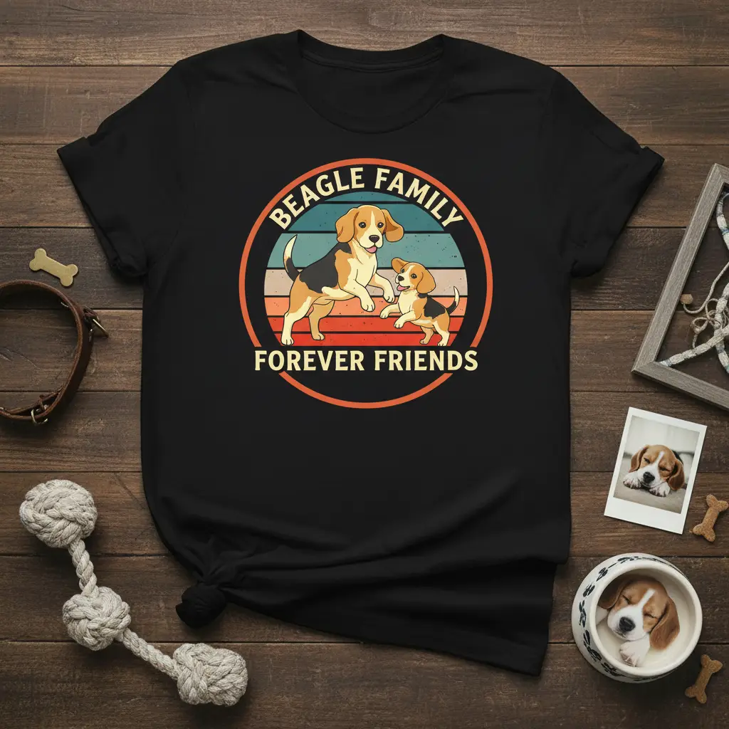 The “Beagle Family Forever Friends” design features a heartwarming illustration of two beagles, an adult and a puppy, playing joyfully within a retro-inspired circular frame. The warm, sunset-like colors and playful typography evoke a sense of nostalgia and pure happiness. This design perfectly encapsulates the spirit of beagles – their friendly nature, their boundless energy, and the deep affection they share with their human families. It’s a visual representation of the joy and love that these dogs bring into our homes every single day.