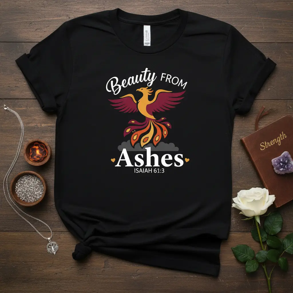 Beauty From Ashes ISAIAH 61:3 is more than just a phrase; it’s a testament to hope, resilience, and the transformative power of faith. This inspirational t-shirt captures that profound message with a stunning design featuring a majestic phoenix rising from symbolic ashes. It serves as a constant reminder that even from difficult times, new beginnings and profound beauty can emerge. Crafted for comfort and style, this tee is perfect for everyday wear or as a thoughtful gift that uplifts and encourages. Embrace the symbolism of rebirth and renewal with this unique piece of Christian apparel.