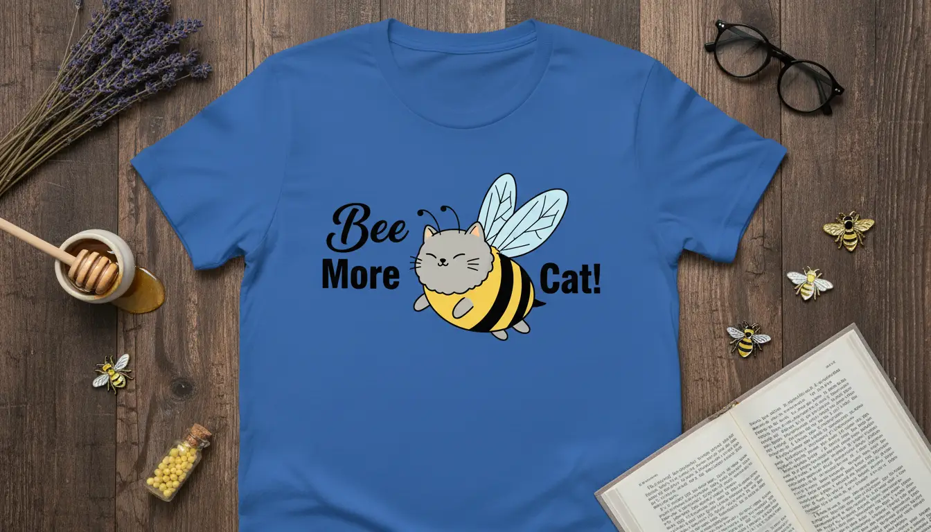 Pick from Black, Navy, Royal, Dark Heather, Red, and White to match your mood and wardrobe staples. Each colorway keeps the Bee More Cat! design clear and photo-ready for everyday wear.