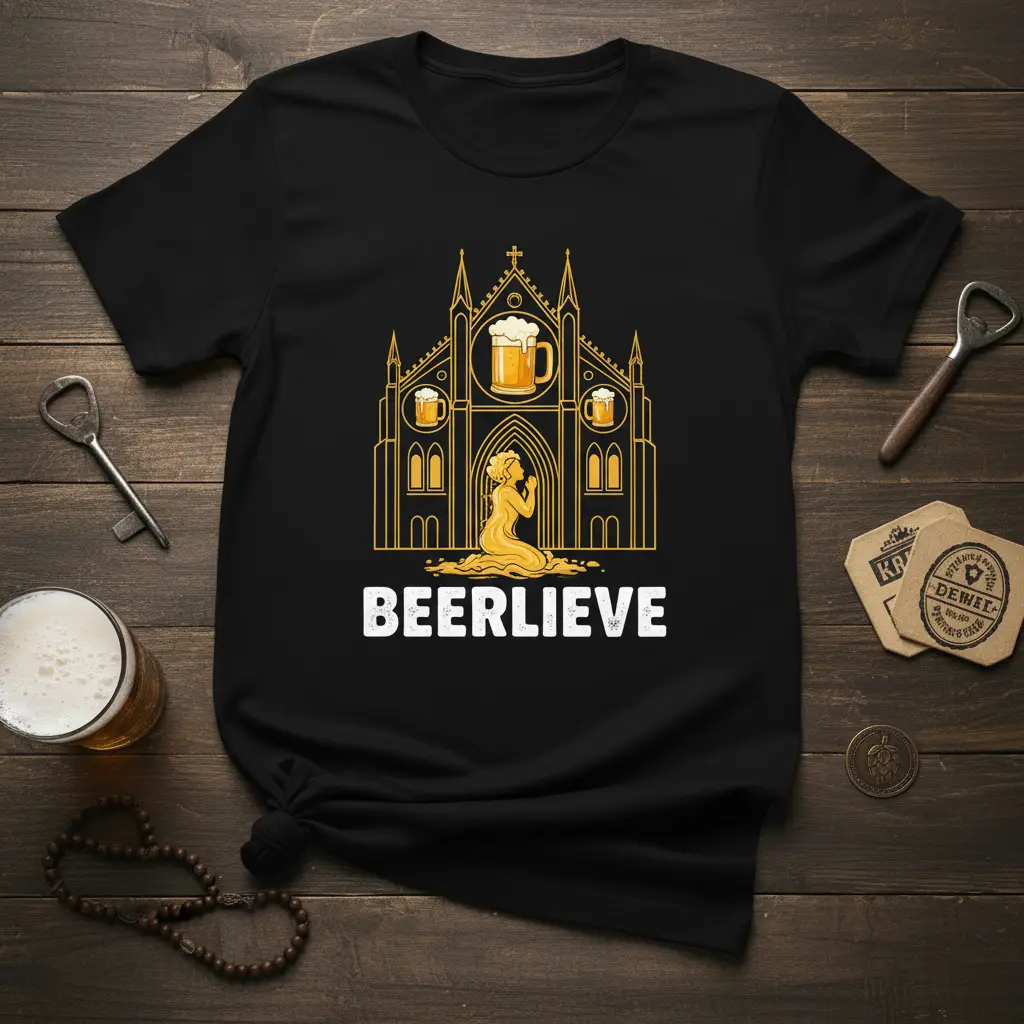 This graphic tee features the clever “BEERLIEVE” text prominently displayed, accompanied by an artistic representation of a church. Within the church’s design, stylized beer mugs replace traditional stained-glass windows, symbolizing where true faith lies for many. A kneeling figure adds a touch of reverence, humorously dedicated to the art of brewing and enjoying a good beer. It’s a design that perfectly encapsulates the passion and camaraderie found within the beer-loving community.