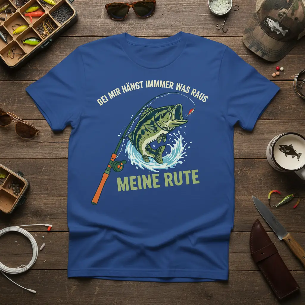 This fishing humor t-shirt is more than just apparel; it’s a statement of dedication to the art of angling. The phrase “Bei mir hängt immer was raus” translates to “Something always comes out with me,” and paired with “MEINE RUTE” (MY ROD), it humorously suggests a guaranteed good time and likely a catch. It’s a perfect way for fishermen to express their love for the sport and their confidence on the water. The design is crafted to appeal to those who appreciate clever wordplay and the universal language of fishing.