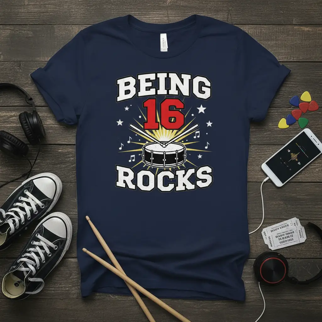 Pick from Black, Navy, Royal, Dark Heather, Red, and White to match your mood and wardrobe staples. Each colorway keeps the BEING 16 ROCKS design clear and photo-ready for everyday wear.