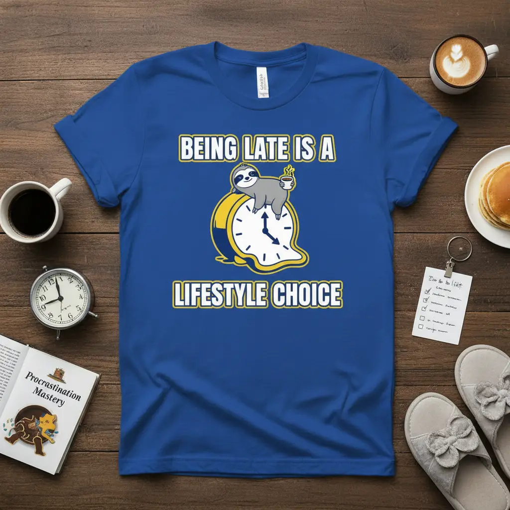 The appeal of this design lies in its relatability. Many people can see themselves in the humorous depiction of time stretching and a sloth’s unhurried pace. It’s a lighthearted way to acknowledge a common human trait and turn it into a source of amusement and personal branding. This BEING LATE IS A LIFESTYLE CHOICE design is perfect for gifting, offering a memorable present that is sure to be cherished and worn often.