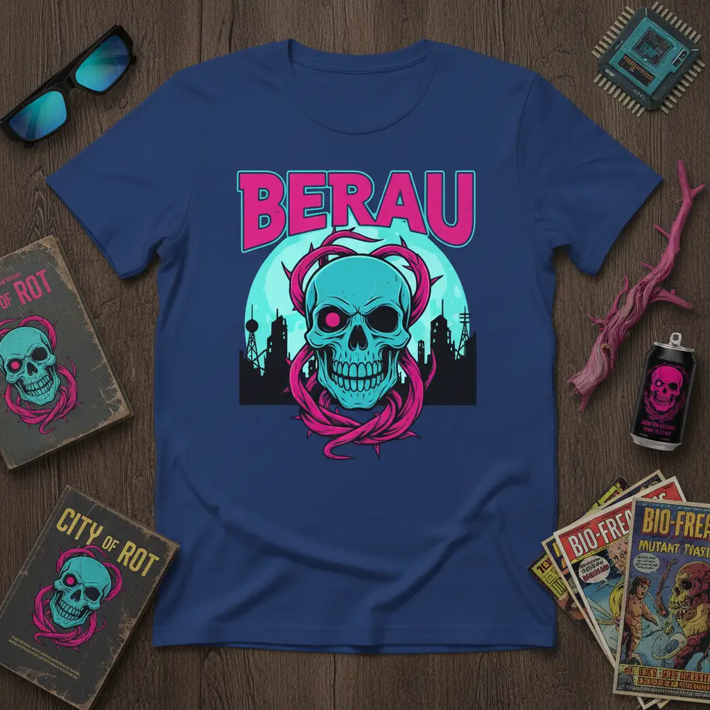 BERAU is more than just a word; it’s a statement, an attitude, and a visual representation of a bold aesthetic. This t-shirt captures that essence with a striking design that merges the urban grit of cyberpunk with the timeless allure of the skull motif. The vibrant teal skull, entwined with thorny pink vines, stands out against a backdrop of a silhouetted cityscape under a haunting moon. It’s a piece designed for those who aren’t afraid to express their individuality and embrace a darker, more intriguing style. This tee is perfect for making a statement whether you’re hitting the streets or just chilling with friends.
