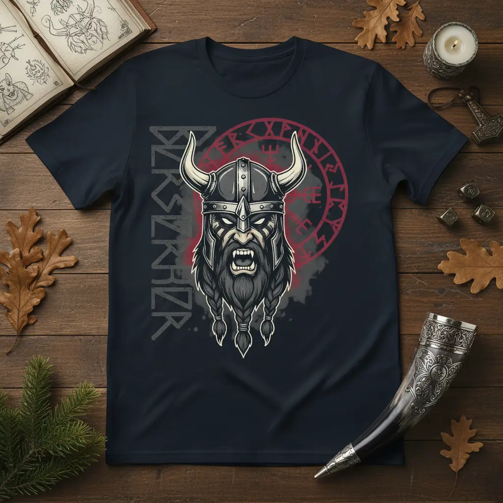 This t-shirt features the commanding word “BESERKER” prominently displayed, evoking the spirit of these legendary warriors. The intricate illustration depicts a formidable Viking warrior, complete with a horned helmet, a full beard styled in braids, and an intense expression. The surrounding runic circle adds an authentic touch of Norse mythology, enhancing the design’s historical and cultural appeal.