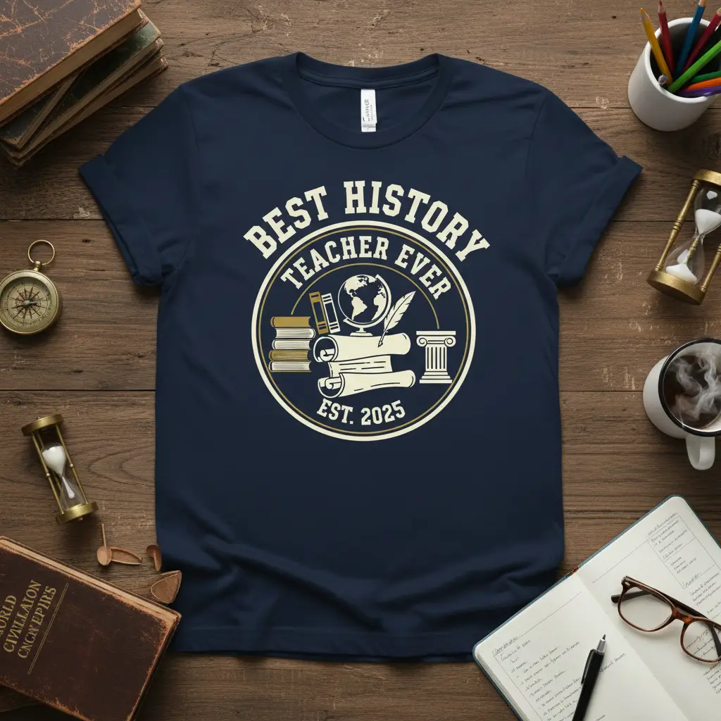 The phrase “BEST HISTORY TEACHER EVER EST. 2025” is prominently displayed, making it clear who this shirt is for. The “EST. 2025” adds a personal touch, marking a significant year for the educator, perhaps their start date or a milestone year. This makes the shirt a thoughtful and personalized gift that acknowledges their journey and commitment to education.
