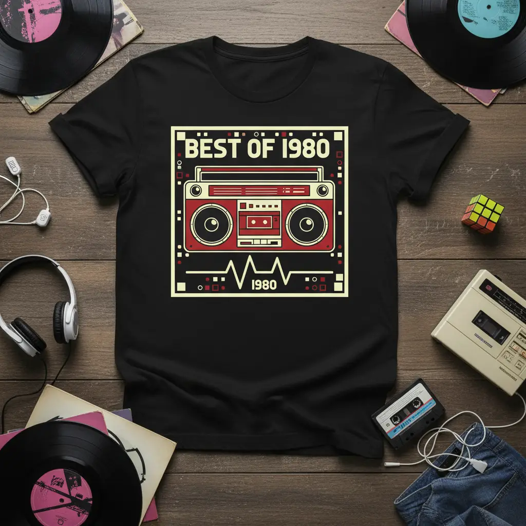 BEST OF 1980 t-shirt celebrates the unparalleled musical achievements and iconic style of that unforgettable year. This design is perfect for anyone who cherishes the vibrant energy of the 1980s, featuring a bold graphic that evokes nostalgia and retro cool. It’s more than just apparel; it’s a statement piece that speaks volumes about your appreciation for classic sounds and timeless trends. Wear your birth year or favorite decade with pride and let the good times roll.