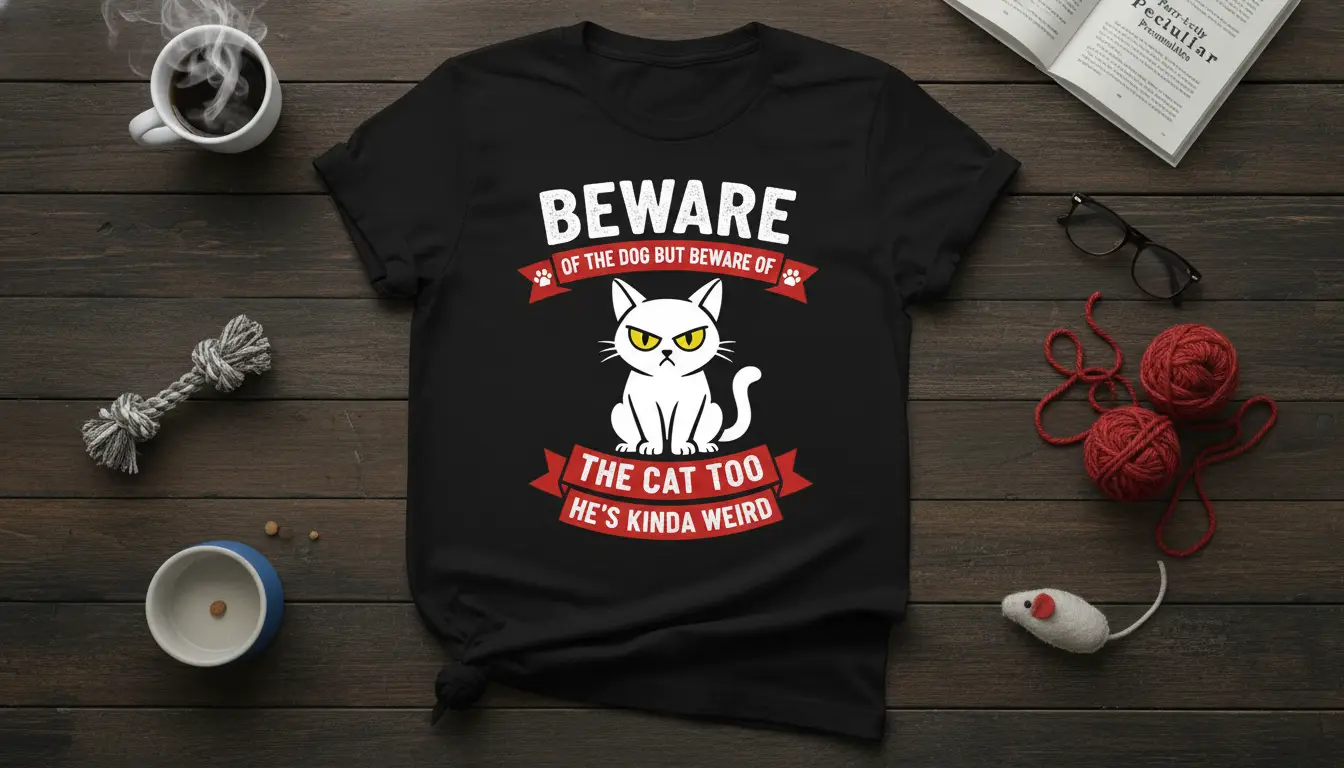 Beware of the dog but beware of the cat too he’s kinda weird, this statement tee is designed for those who truly understand the dynamic of a multi-pet household. It’s more than just a shirt; it’s a humorous declaration of love and a candid observation about the unpredictable nature of our beloved feline companions. The design features bold typography that immediately grabs attention, paired with a hilariously grumpy cat graphic that perfectly embodies the sentiment. This apparel is crafted for comfort and style, making it an ideal choice for casual outings, lounging at home, or as a unique gift for fellow pet enthusiasts.