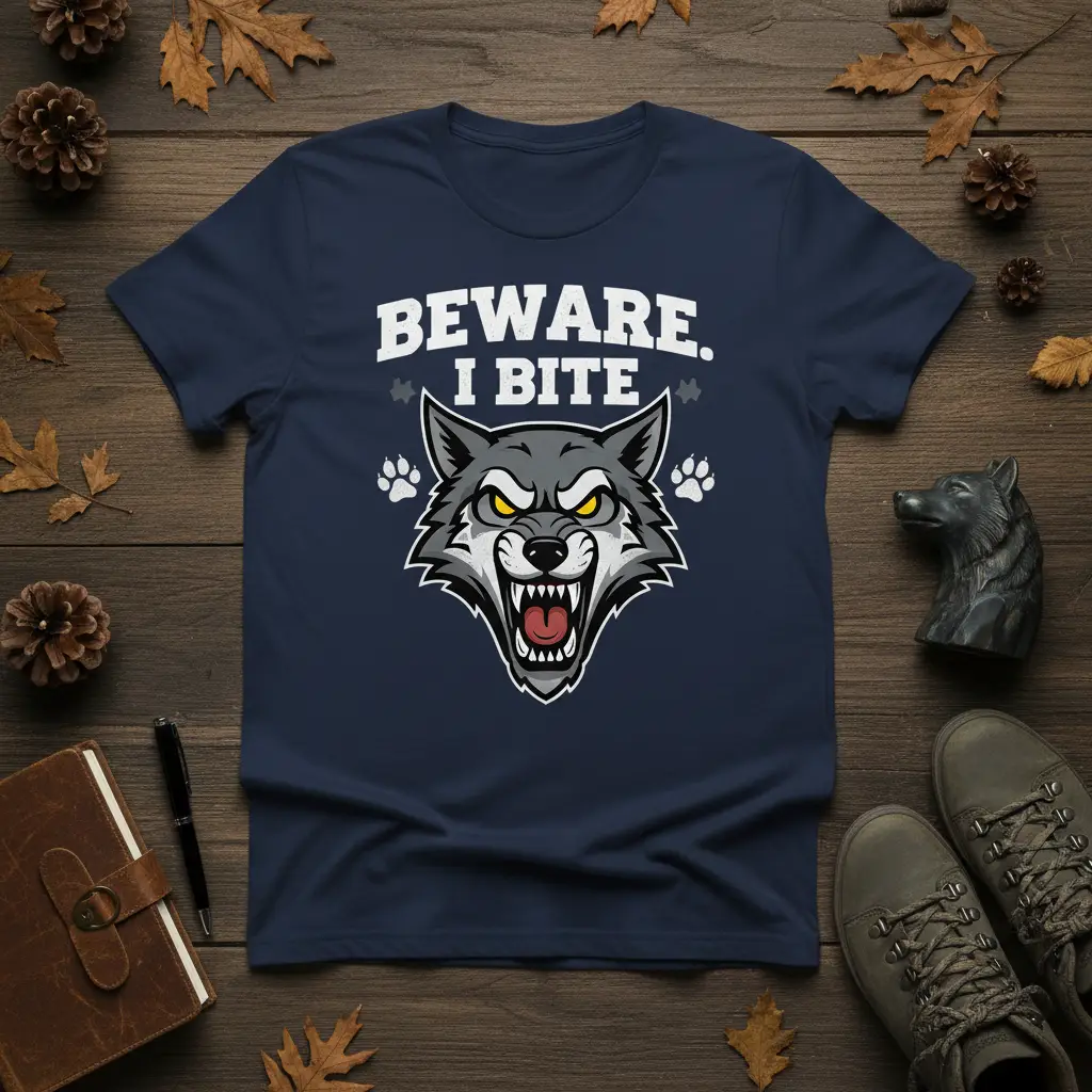Accompanying the wolf’s head are two distinct paw prints, reinforcing the animalistic theme and adding a dynamic element to the artwork. The bold white lettering of “BEWARE. I BITE.” stands out vividly against the shirt’s background, ensuring the message is clear and impactful. This combination creates a wearable piece of art that speaks volumes about the wearer’s personality and interests.