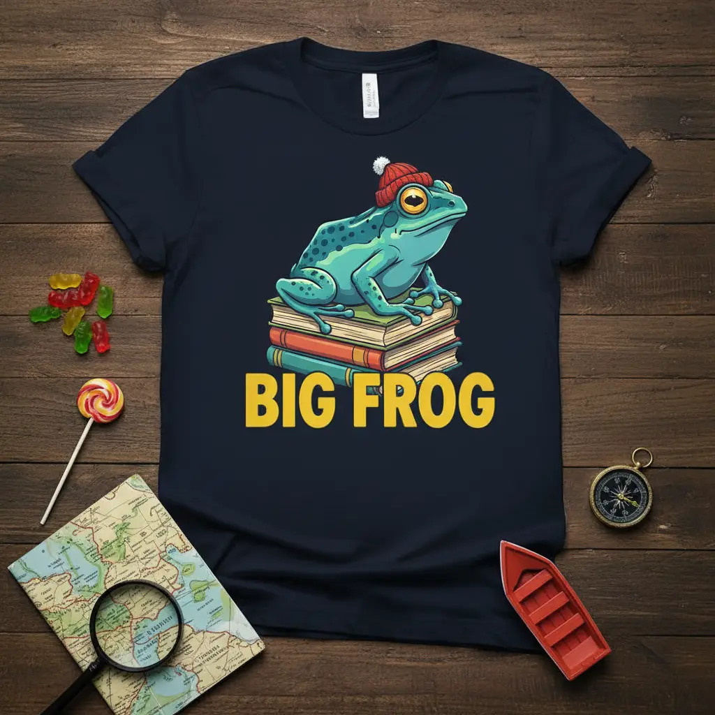 This captivating design features a cheerful, cartoon-style frog sporting a cute red beanie, sitting comfortably on a pile of colorful books. The bold, yellow “BIG FROG” text below ties the entire graphic together, creating a memorable and eye-catching visual. It’s the perfect way to celebrate your love for reading and all things amphibian.