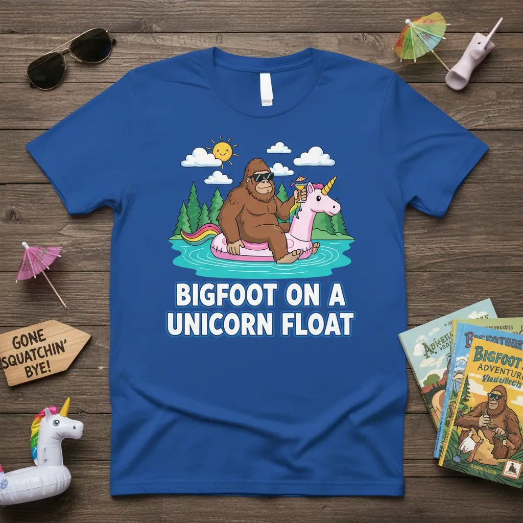 Pick from Black, Navy, Royal, Dark Heather, Red, and White to match your mood and wardrobe staples. Each colorway keeps the BIGFOOT ON A UNICORN FLOAT design clear and photo-ready for everyday wear.