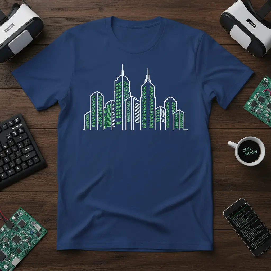 This unique design captures the essence of the digital age, presenting a stylized cityscape where the windows of each building are meticulously crafted from binary code. The clean lines and modern aesthetic make it a standout piece for any wardrobe. It’s a perfect way to express your connection to the world of technology, programming, and innovation.