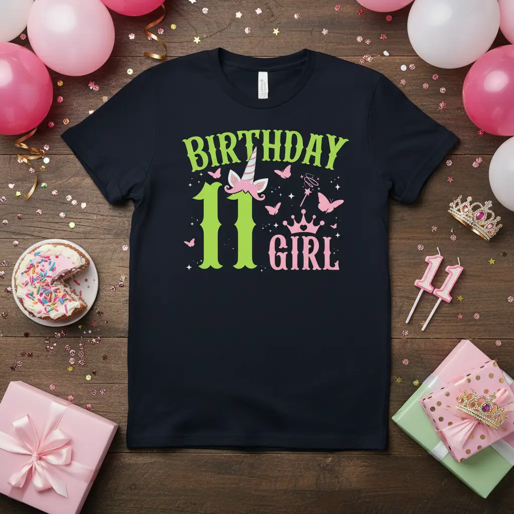 The primary message, “Birthday 11 Girl,” is presented with a blend of bright green and soft pink, making it pop against the fabric. This t-shirt is an excellent way to express her personality and celebrate her journey to eleven years old.