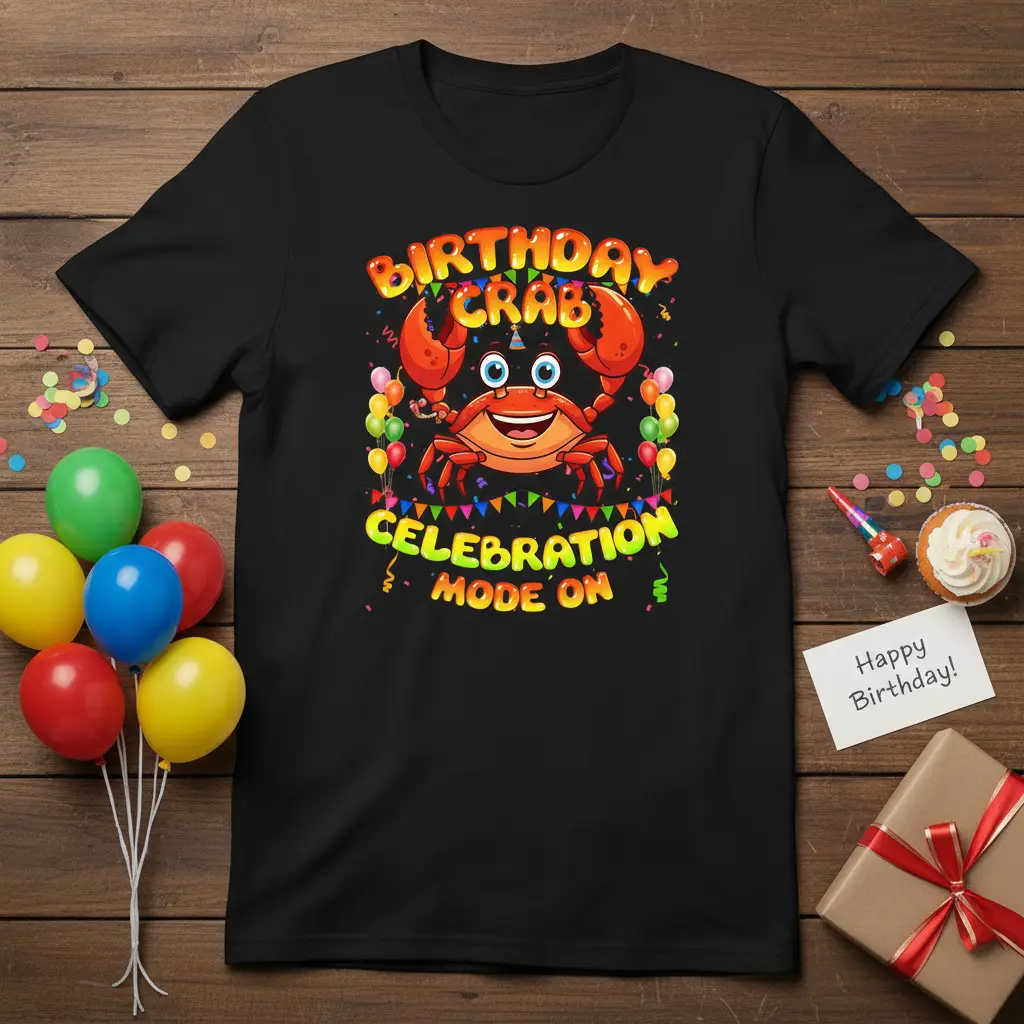 Birthday Crab Celebration Mode On – it’s time to party! This lively t-shirt design captures the ultimate festive spirit, perfect for anyone ready to celebrate their special day with gusto. Featuring a cheerful cartoon crab surrounded by colorful balloons and confetti, this graphic tee is an instant mood booster. It’s ideal for birthdays, themed parties, or simply bringing a smile to everyone you meet. Get ready to embrace the fun and make unforgettable memories with this celebratory apparel.