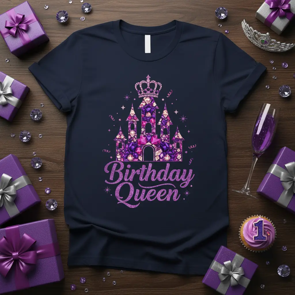 The phrase “Birthday Queen” is emblazoned in a beautiful, glittering font that catches the light, adding an extra touch of sparkle. This design is perfect for any child who dreams of castles, princesses, and royal parties. It’s a wonderful way to commemorate her age and her status as the star of the day, creating a memorable and photo-worthy look.