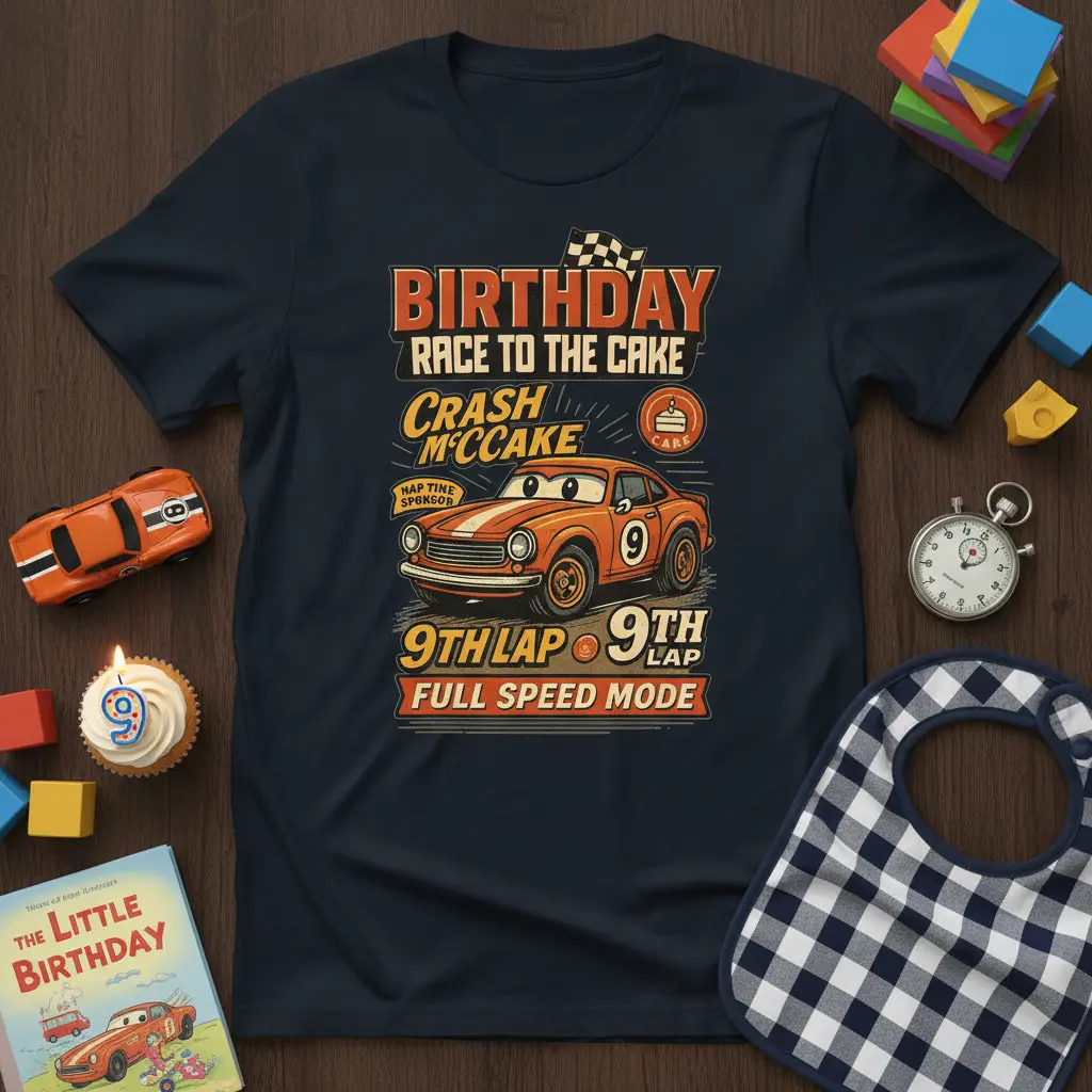 This unique t-shirt is the perfect attire for any birthday boy or girl hitting the big 9. The “Birthday Race to the Cake” theme combined with “Crash McCake” adds a fun, narrative element that kids will love. It’s designed to be the highlight of their birthday outfit, making them feel like the star of their own racing event. The “9th Lap” signifies reaching a significant milestone, while “Full Speed Mode” captures the boundless energy of childhood.
