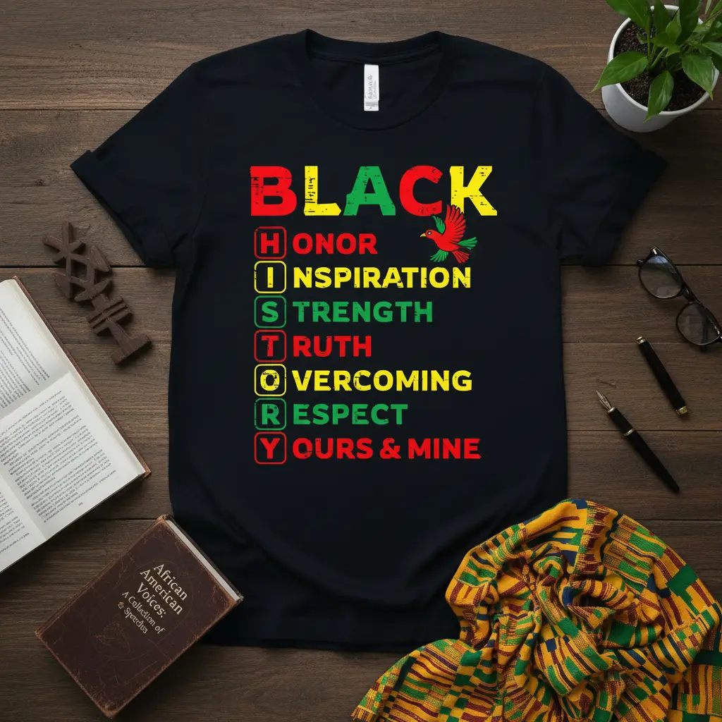 The acronym beautifully encapsulates key virtues and historical themes, making it a meaningful addition to any wardrobe. Each word—Honor, Inspiration, Strength, Truth, Overcoming, Respect, Yours & Mine—contributes to a powerful narrative of perseverance and cultural significance. This shirt is a wearable testament to the enduring legacy and ongoing journey of Black people worldwide.