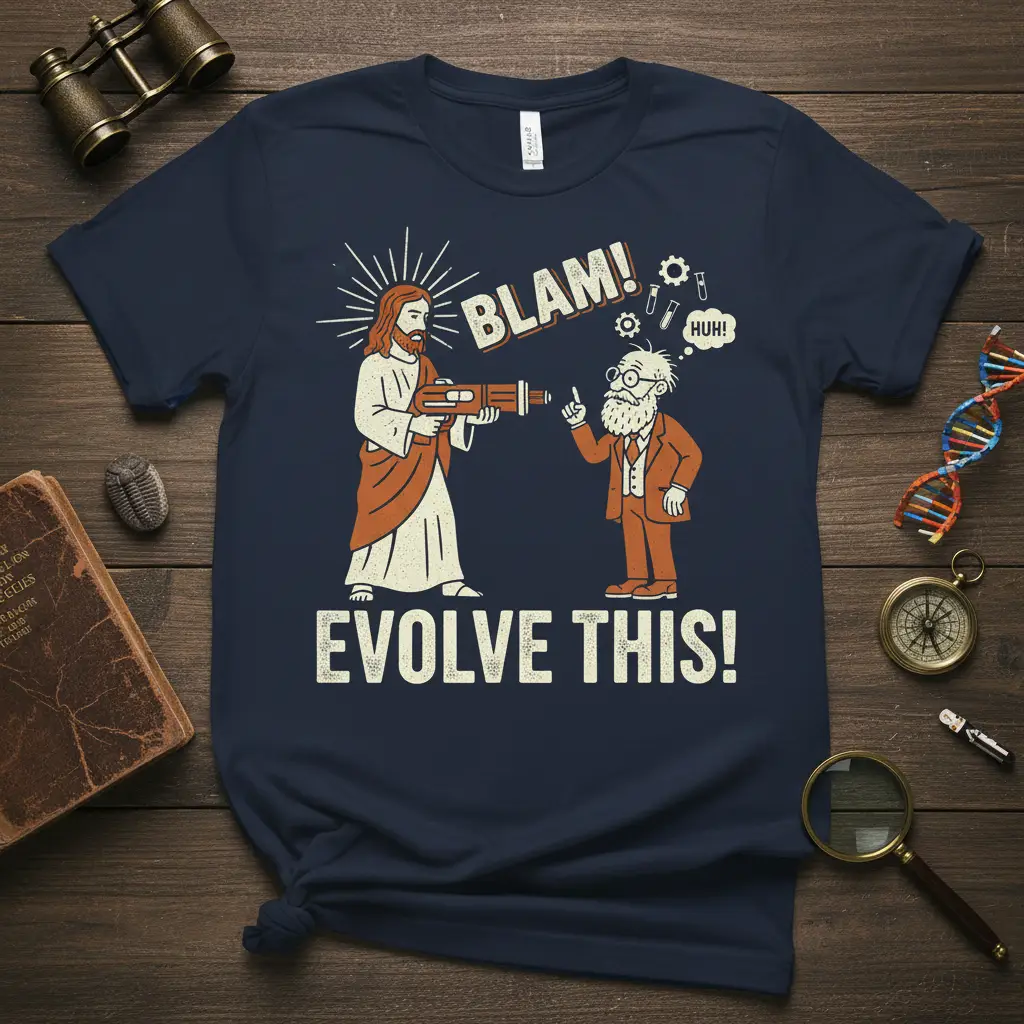 This “BLAM! EVOLVE THIS!” t-shirt hilariously captures the evolution debate with iconic figures. It’s a comfortable and unique way to express your views or give a memorable gift. Made from quality material, this tee is perfect for sparking conversations.