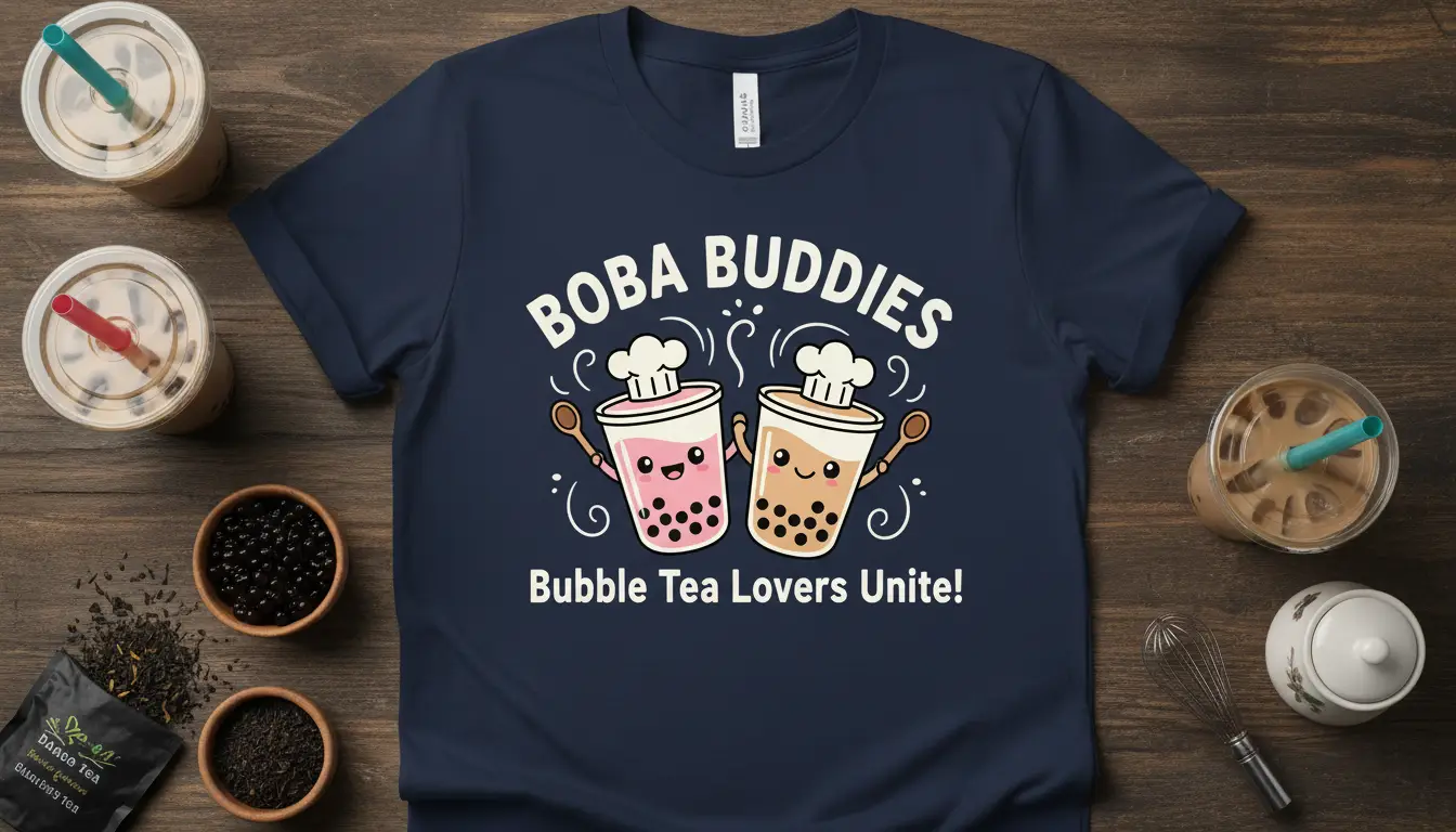 The adorable graphic features two smiling boba cups, each adorned with a chef’s hat and holding a spoon, symbolizing the joy and craftsmanship involved in creating the perfect boba drink. These characters exude happiness and friendship, making the “Boba Buddies” theme truly come alive. It’s an ideal way to showcase your passion for this beloved beverage.