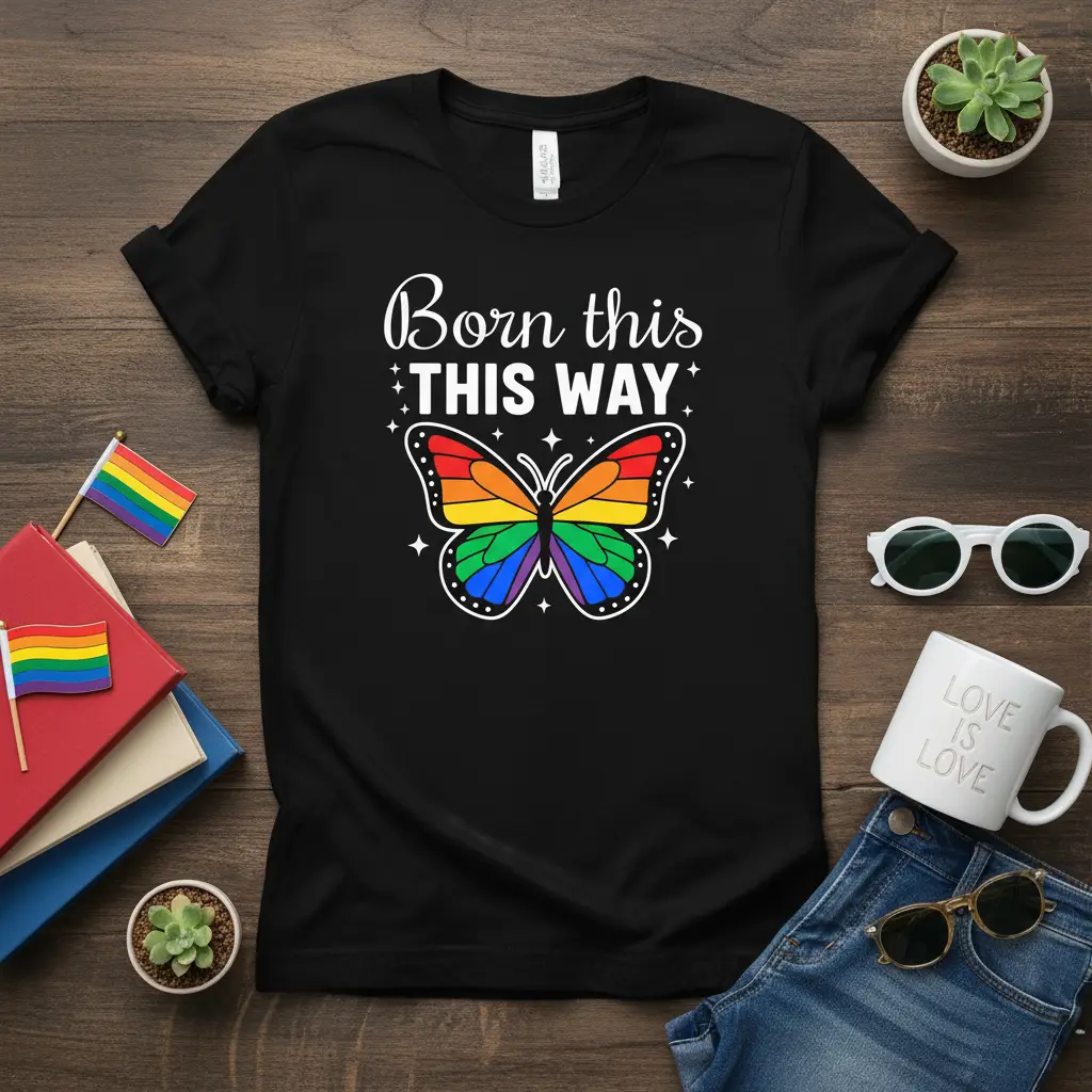 This “Born This Way” t-shirt is more than just clothing; it’s a statement of self-love and empowerment. The striking design, featuring the iconic rainbow butterfly and affirming text, is sure to turn heads and spark meaningful conversations. It’s an opportunity to share your story and celebrate the journey of becoming your true self. Embrace the message and wear your truth with pride and confidence, knowing you are part of a vibrant and supportive community.