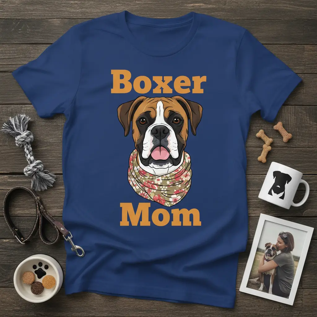 This t-shirt proudly displays the phrase “Boxer Mom” in eye-catching typography. It’s adorned with a delightful illustration of a Boxer dog’s face, complete with its signature expressive eyes and a charming floral scarf. This design captures the sweet and spirited nature of the breed, making it instantly recognizable to fellow Boxer enthusiasts. It’s a conversation starter and a clear declaration of your love for your canine family member.