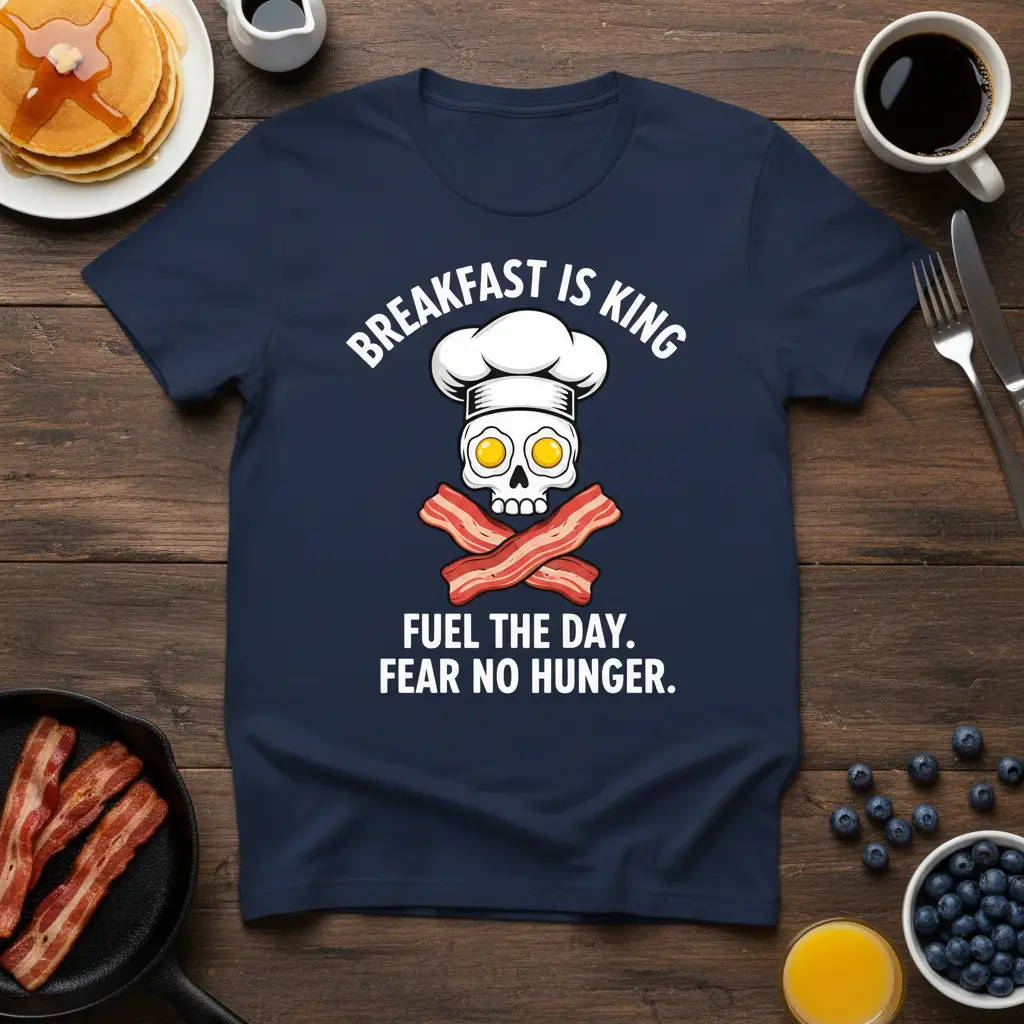 The phrase “BREAKFAST IS KING FUEL THE DAY. FEAR NO HUNGER.” perfectly encapsulates the energy and enthusiasm that a great breakfast provides. This t-shirt is designed for those who don’t just eat breakfast, but revere it. It’s a conversation starter for fellow food enthusiasts and a clear statement to anyone who underestimates the importance of the first meal of the day.