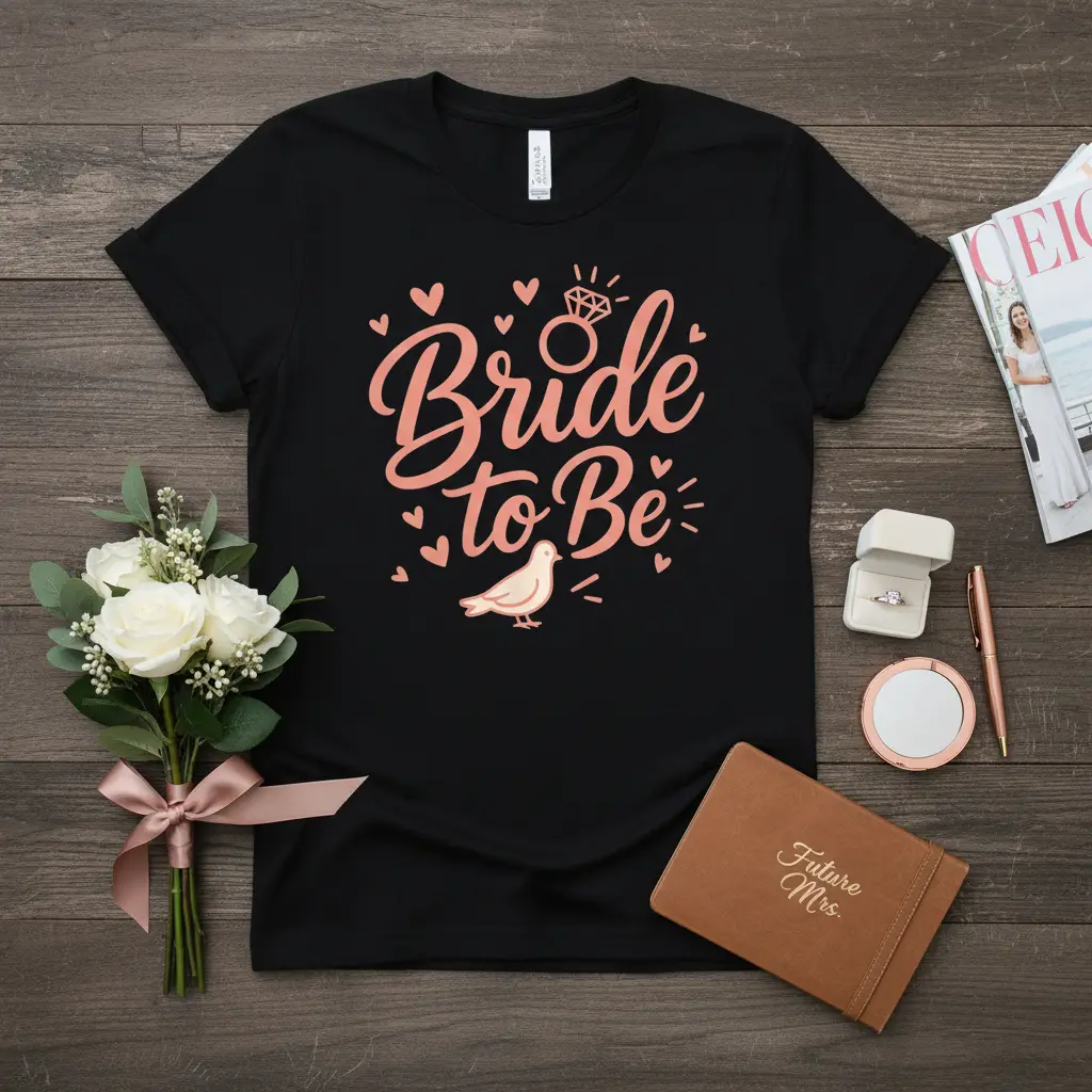 This delightful t-shirt proudly proclaims “Bride to Be” in an elegant coral script that’s sure to catch the eye. Adorned with playful hearts, a dazzling diamond ring icon, and a sweet dove, the design embodies the joy and anticipation of becoming a Mrs. It’s the ideal way for any bride-to-be to express her excitement and announce her upcoming nuptials.