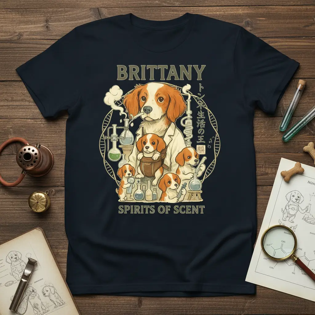 The Brittany breed is renowned for its keen senses, particularly its incredible sense of smell. This T-shirt design pays homage to that innate talent, depicting a distinguished Brittany in a lab coat, surrounded by its playful pups and an array of scientific instruments. The phrase “Spirits of Scent” evokes the dog’s ability to track and detect, turning a beloved pet into a charming scientist.