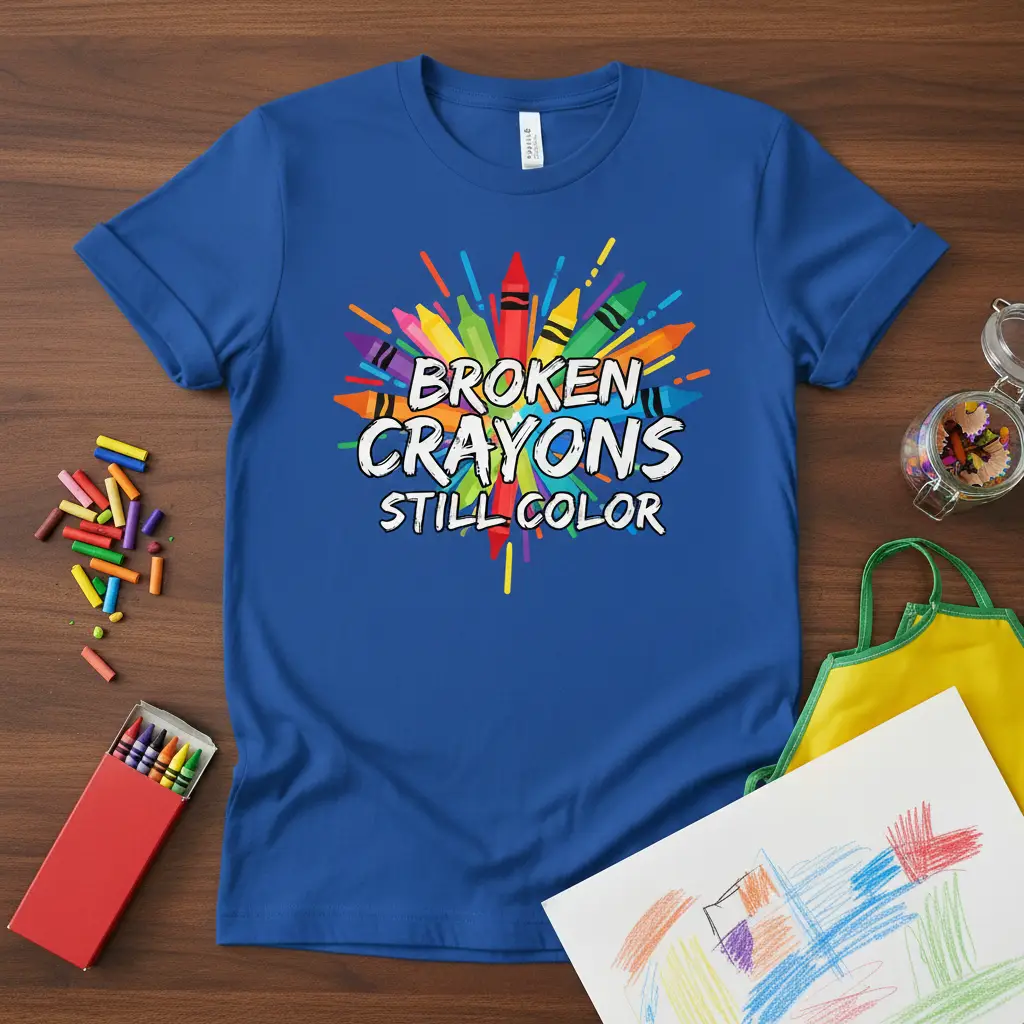 This unique t-shirt is designed to inspire and uplift. The message “BROKEN CRAYONS STILL COLOR” speaks volumes about overcoming obstacles and finding ways to express oneself, no matter the limitations. It’s a powerful symbol for anyone who has faced challenges but continues to create and thrive.