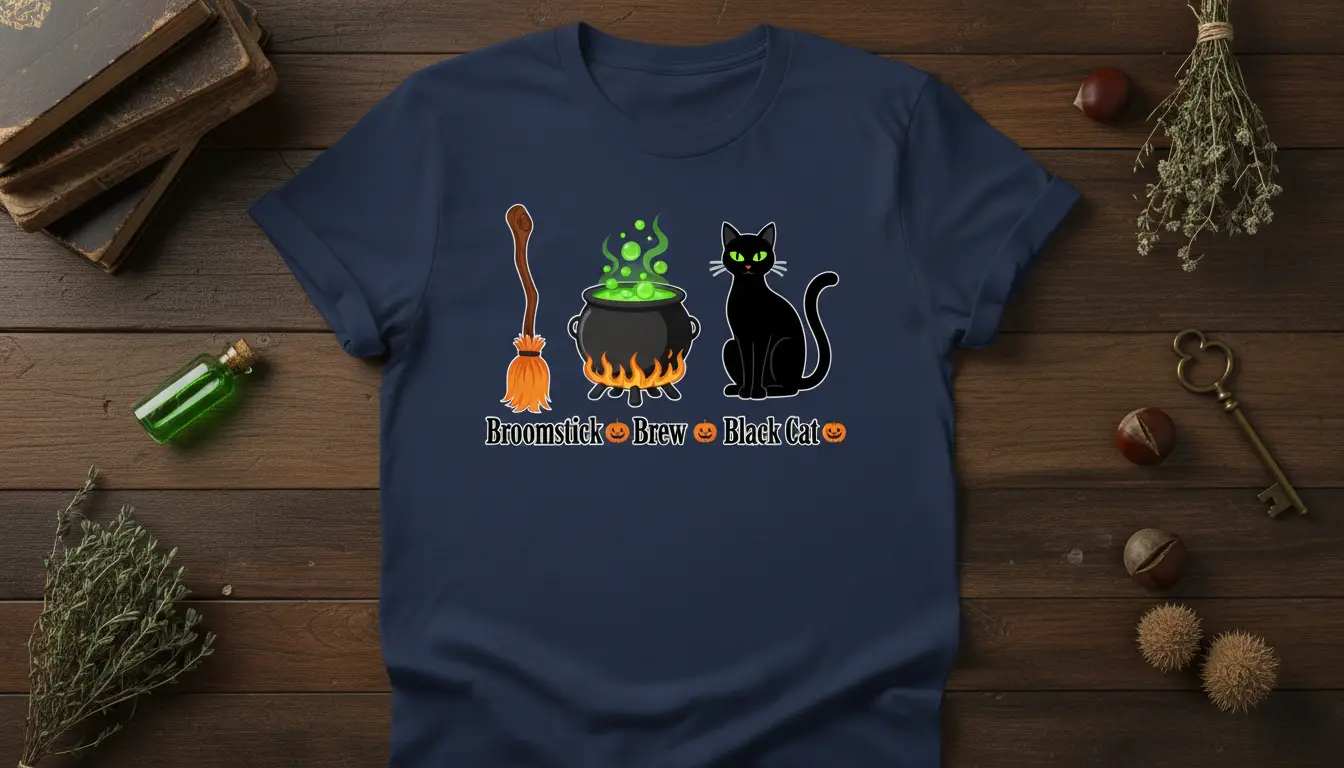 Broomstick Brew Black Cat design is the ultimate way to celebrate the most enchanting time of the year. This t-shirt is perfect for anyone who loves the magic of Halloween, from witches and wizards to cat enthusiasts and lovers of all things spooky. It perfectly captures the essence of the season with its charming graphics and playful theme, making it a standout piece for your autumn wardrobe. Get ready to cast a spell of style and fun with this delightful Halloween apparel.