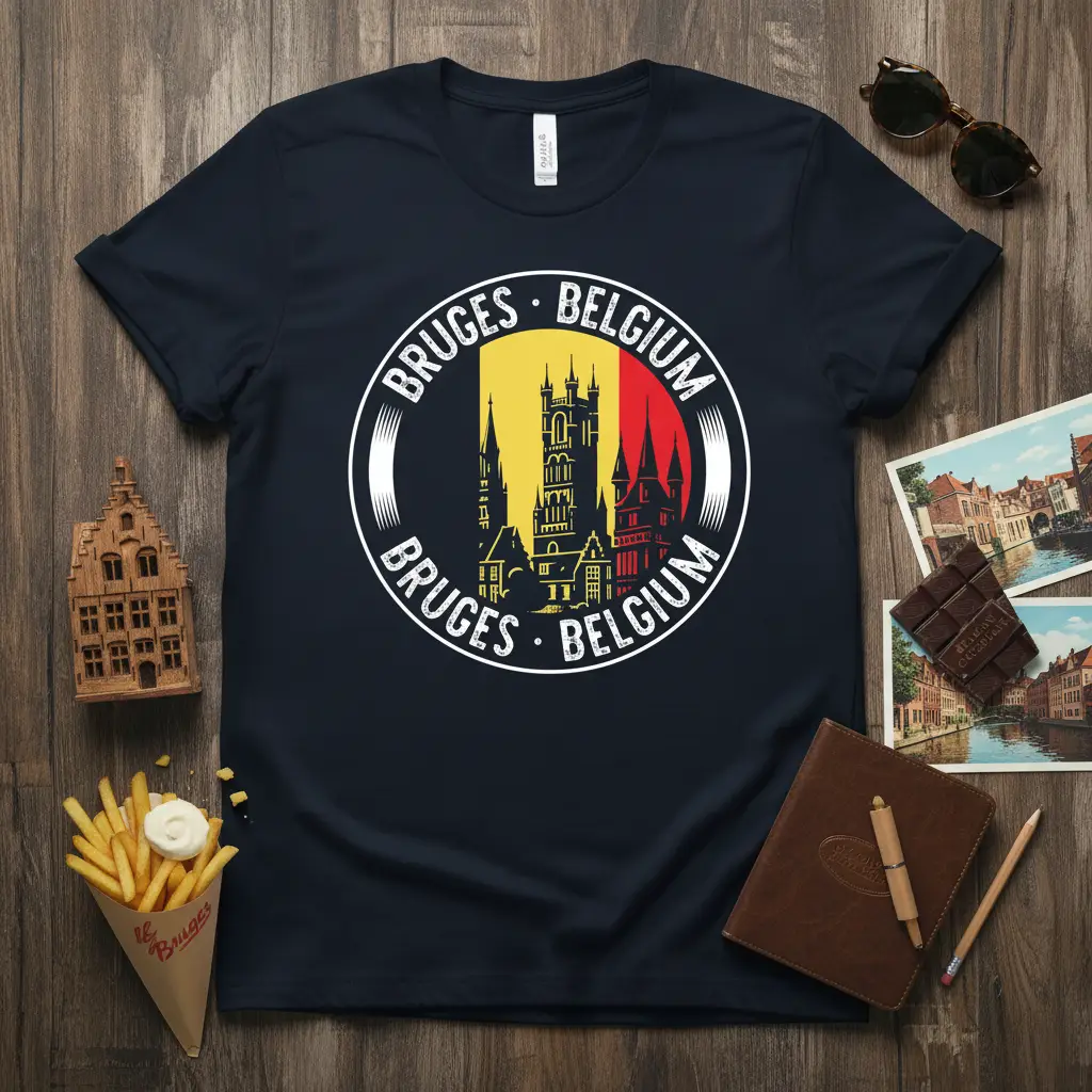 Bruges Belgium is a city that captures the imagination, known for its charming canals, historic architecture, and rich cultural heritage. This t-shirt design encapsulates the essence of Bruges, making it a perfect keepsake for travelers and a stylish statement piece for anyone who appreciates European beauty. It features a detailed illustration of the city’s iconic skyline, set against the vibrant colors of the Belgian flag, symbolizing national pride and a deep connection to this enchanting destination. Whether you’re reminiscing about a past trip or dreaming of a future adventure, this tee is designed to evoke the magic of Bruges.