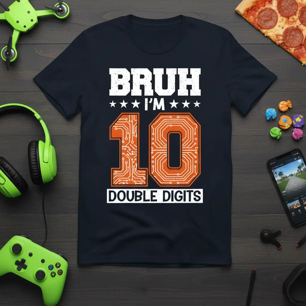 Bruh I’m 10 Double Digits! This phrase perfectly captures the excitement and slight disbelief of a child officially entering double digits. Our t-shirt design celebrates this significant milestone with a cool, tech-inspired graphic that’s sure to be a hit with any 10-year-old. It’s more than just apparel; it’s a declaration of a new age and a fun way to mark a memorable birthday. Make their tenth birthday unforgettable with a gift that speaks to their growing personality and interests.