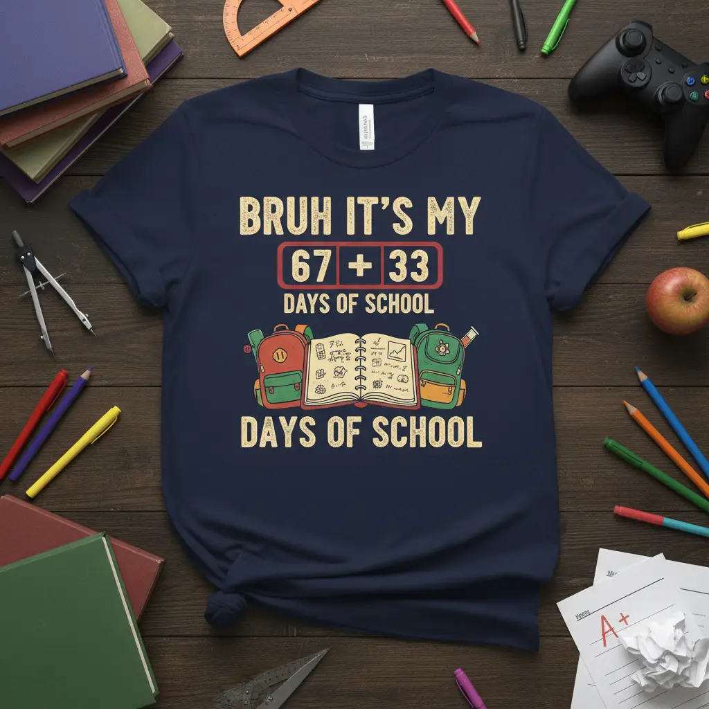 Bruh It’s My 67 + 33 Days of School shirt is designed for students and teachers alike, marking a significant academic achievement with humor and style. This festive tee captures the essence of reaching the 100th day of school, a milestone celebrated across elementary grades. It’s a perfect conversation starter and a fun way to commemorate this special occasion. Show your school spirit and your math prowess with this unique design that’s sure to be a hit among classmates and educators.