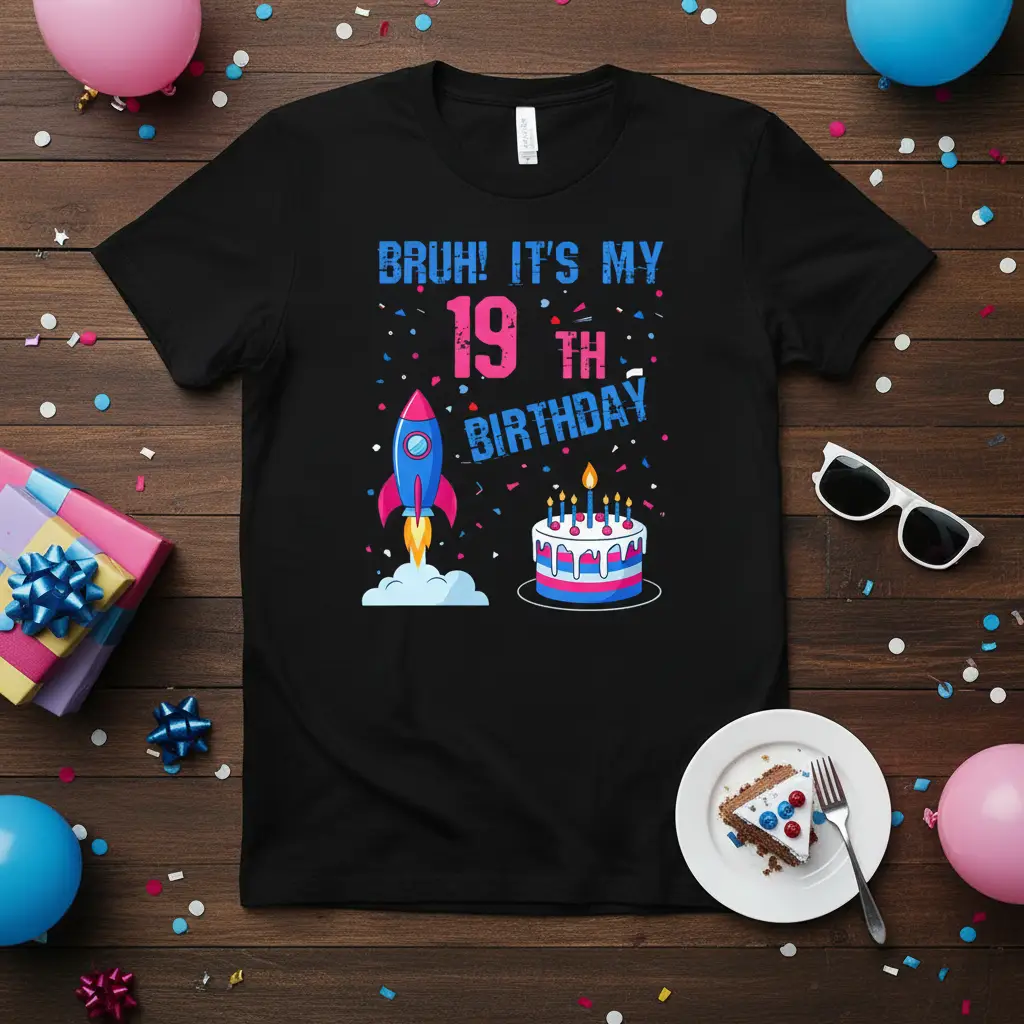 This “Bruh! It’s My 19th Birthday” t-shirt is more than just clothing; it’s a wearable celebration. The playful design features a cool rocket blasting off, symbolizing the exciting journey ahead, alongside a delicious-looking birthday cake ready to be enjoyed. It’s the perfect blend of fun, youthful energy, and birthday cheer, making it an ideal choice for any nineteen-year-old.