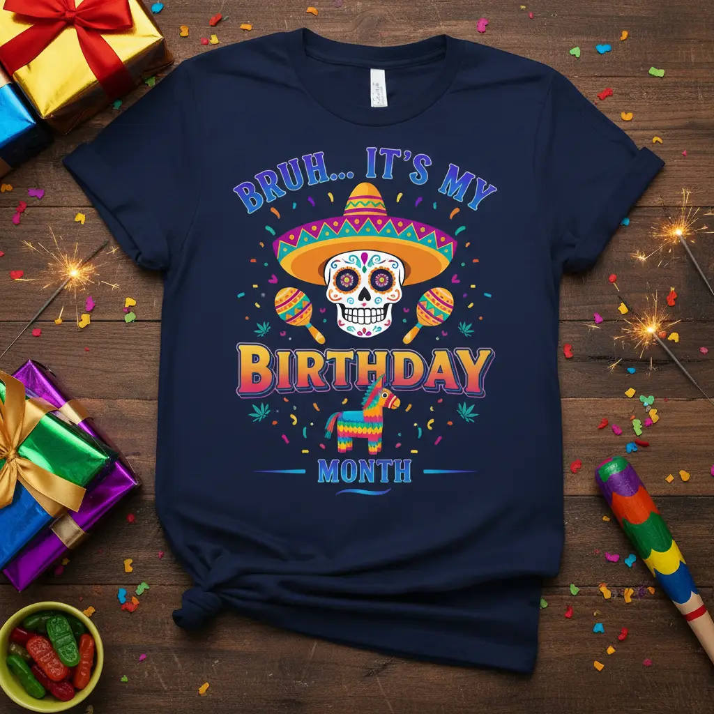 Embrace the vibrant energy of a fiesta with this Mexican skull-themed birthday tee. The intricate details of the sugar skull, combined with the festive sombrero and maracas, evoke a sense of joy and celebration. This Bruh It’s My Birthday Month design is designed to make you feel special and ready to party throughout your entire birthday month. It’s a perfect blend of cultural artistry and birthday cheer, making it a must-have for any celebrant.