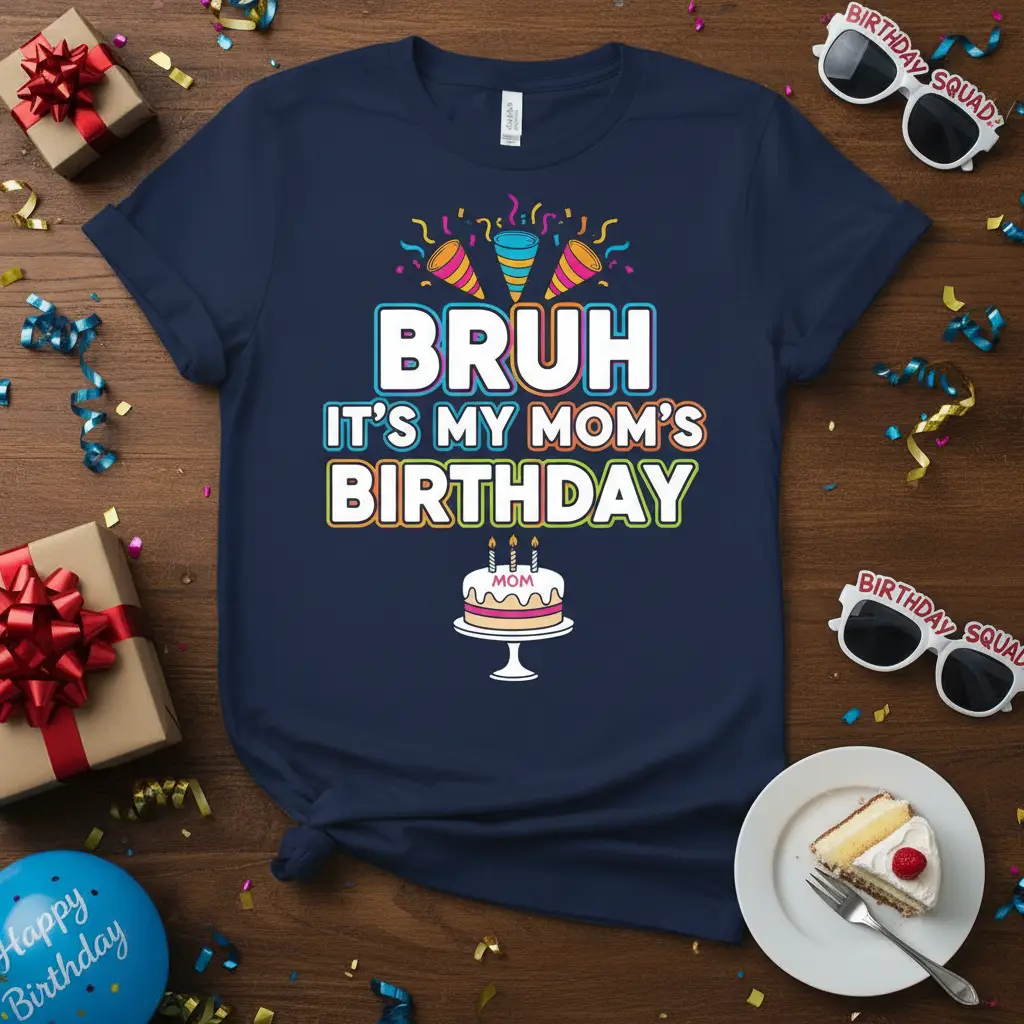 Pick from Black, Navy, Royal, Dark Heather, Red, and White to match your mood and wardrobe staples. Each colorway keeps the BRUH IT’S MY MOM’S BIRTHDAY design clear and photo-ready for everyday wear.