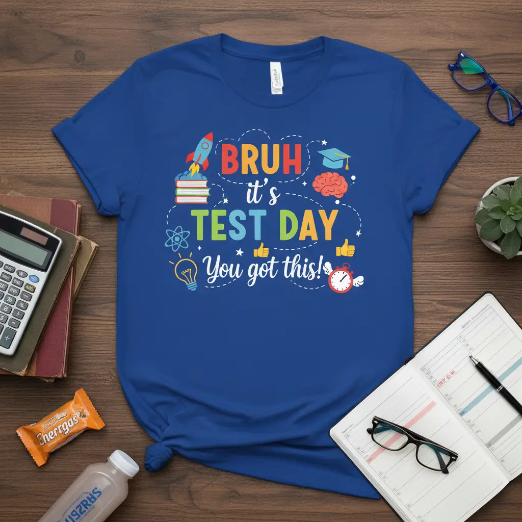 BRUH it’s TEST DAY You got this! This statement t-shirt is designed to bring a smile to students’ faces and boost their confidence as they head into important exams or challenging school days. Featuring a vibrant and engaging design, it perfectly captures the mix of nerves and determination that comes with test day. It’s more than just apparel; it’s a wearable pep talk, a fun way to express solidarity, and a reminder that success is within reach. This tee is an excellent choice for anyone looking to add a touch of humor and encouragement to their academic journey.